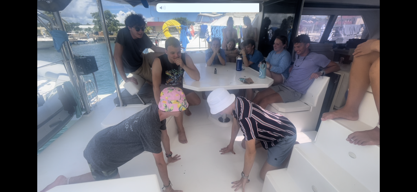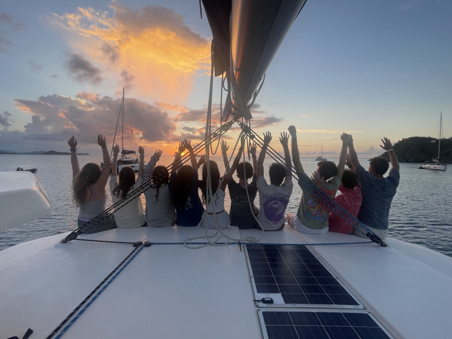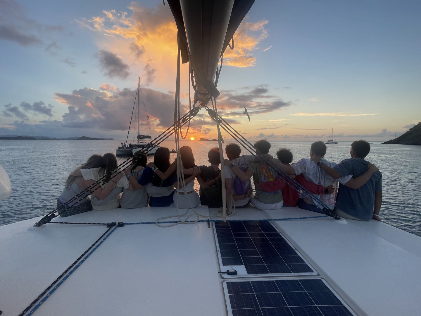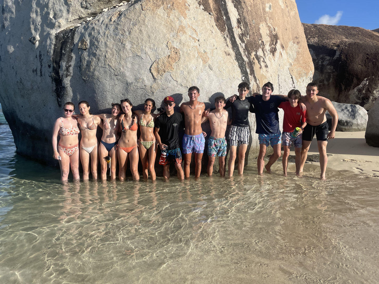 Today a majority of the students on Event Horizon woke up on the hard top. We woke up to the sounds of a bustling crew setting up for sail, a little tired from the previous nights singing and relentless chatting. The crew on the Event Horizon is turning into a tight-knit cohort, a group of friends with inside jokes and bonds forming. Our first stop for the day was an awaited trip to the baths. Most people fell right back asleep for the trip to the baths. However, all fatigue was erased when cliff jumping and beach time were nearing after a dingy ride by our expert dingy commander Matt. The morning hours were spent swimming, jumping, and an epic chicken fight starting with Emily and Grace, but soon caught on to the dynamic submarine attack duo, Player and Avi. After what felt like an eternity of fun, the crew returned to the boat exhausted. It was only 9:30. After a 45-minute trip to the Spanish, and after a proper Hippo-cleanse, the crew disembarked for our first restaurant meal and ice cream of the trip. After a stop at the dive shop and a volleyball and football purchase, a few of the more motivated people made a seemingly endless journey to the supermarket to restock boat essentials – candy and snacks. Even though the journey was long, the unique experience was worth it. Jumping forward to the boat ride between Spanish Town was a trip to remember. With beautiful singing, dancing, cards, and a full nail makeover, the crew made the 30-minute trip to the dive site and the waters, where eventually, the crew would settle for the night. However, nothing could prepare the crew for the hectic dive that ensued without going into the details; the dive was a crazy experience with lots of unexpected complications. However, the crew overcame these complications and turned a hard dive into an experience to remember. With a remarkable underwater dance performance from the bilingual dive buddy duo Oliver and Owen, the dive ended in laughter. To continue the day, Lila and Grace began a performance to pitch perfect music. As the day came to a close and Tommy took some crew sunset pictures, the day resolved with high spirits. As Cole said perfectly in the squeeze, there were too many high points in the day to choose from, and the day had felt like 4 separate ones. One of the amazing things about AQ is the bonds you build on these trips, especially on days like these.