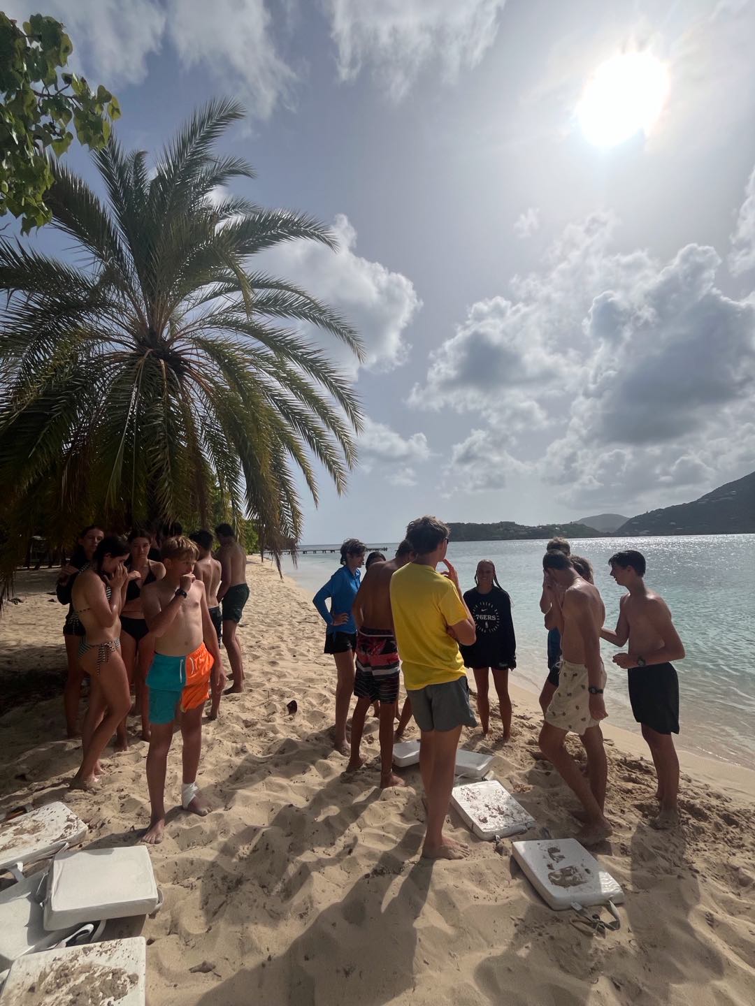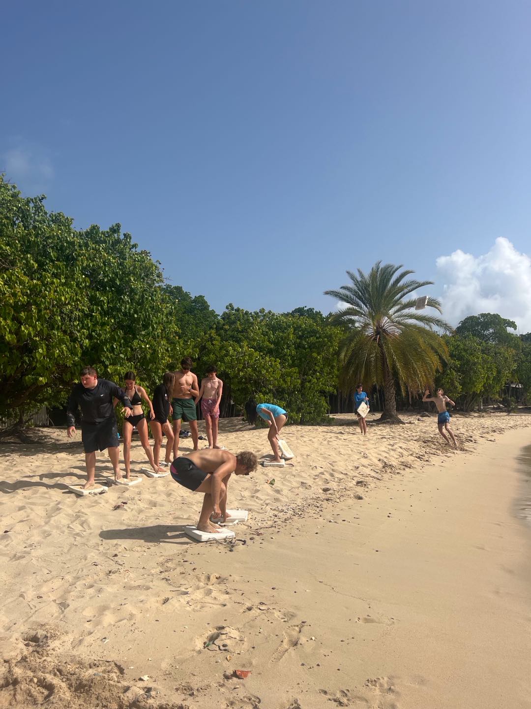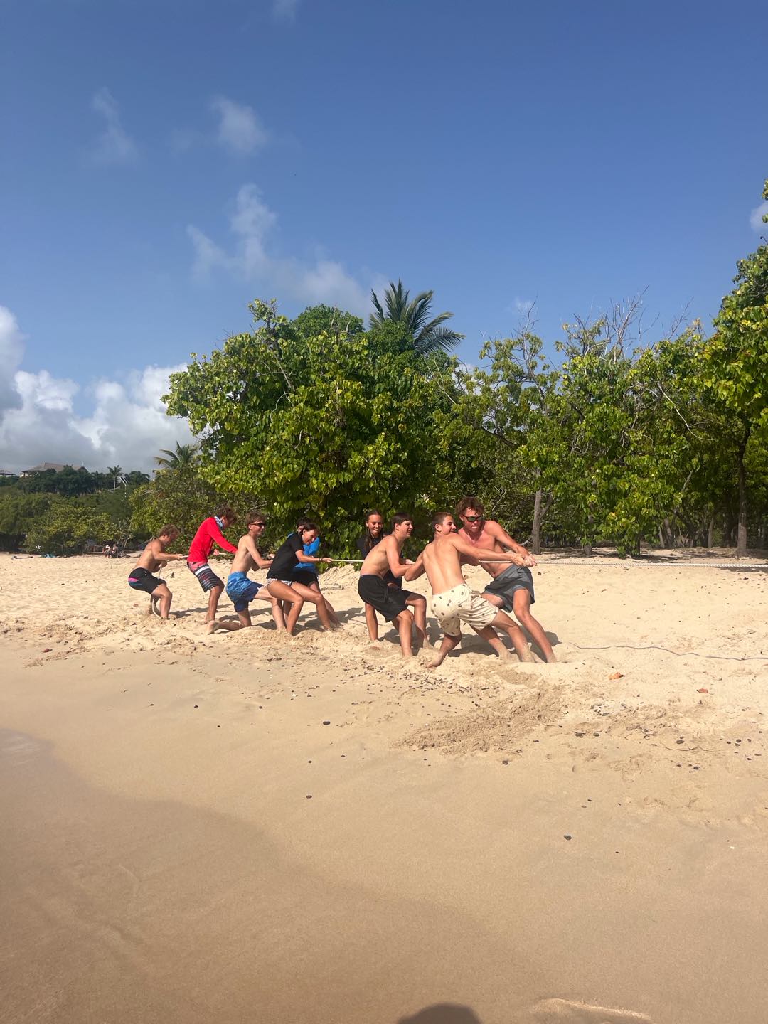 We then went souvenir shopping, most people got some sort of t-shirt or hat, Ellery and I got some really cute matching t-shirts. We all made it back to the boat at around three-ish and got ready for the beach Olympics. We walked from the boat to the beach for around 15 minutes, but everyone enjoyed the walk because we saw how pretty Antigua is. At the beach Olympics, we played two games: tug of war and a game called Chicklet Jump against the other boat, Hagan Time. Unfortunately, we lost both… womp womp 😢 and the prize was ice cream that the other boat won. Jackson was the one who was most disappointed about the loss. Once the exciting events we all decided to stay and hangout for awhile at the beach after the events were all wrapped up. Most of the boat forgot about losing because we all could agree that we were all excited for the AC and fresh water showers.