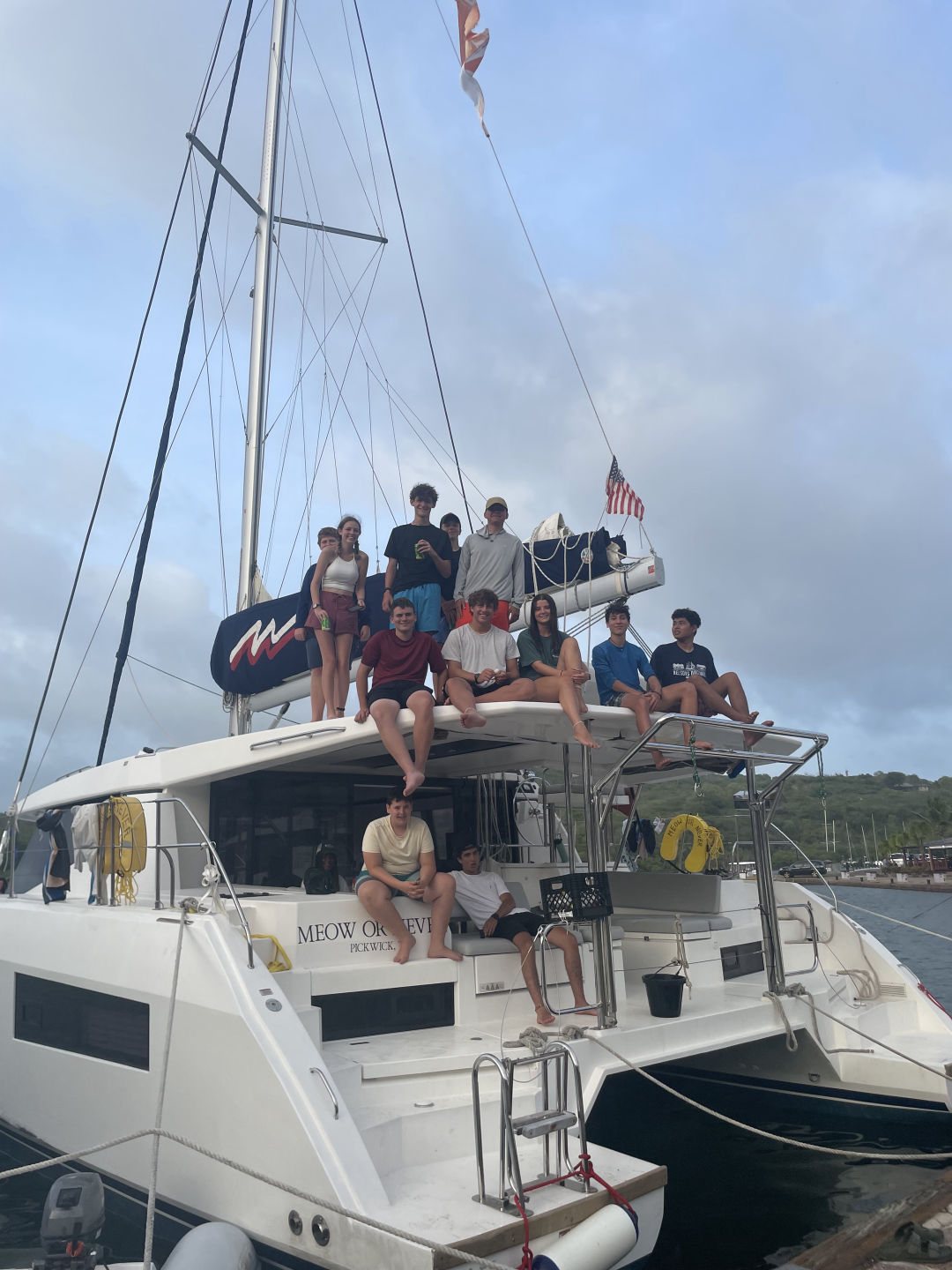 After a recovering night’s sleep from the hike the day before, everyone was refreshed and ready to tackle small boat sailing. With the students from Meow or Never joining us, we walked for about 10 minutes from Old English Harbour to the small boats on the dock. Everyone, including the Meow students, was divided into groups of two or three for each of the boats. Me, Theo, and Ethen were in one group, Claire and Ari C were in another, followed by Aidan, Alejandro, and Anno, and lastly, Mary, Carolina, and Jada, all from Meow or Never. Nick, because of his knowledge of small-boat sailing, took a boat with Davis. Everyone learned how to tack and use the jib while experiencing the thrill and excitement of small boat sailing. After a couple of hours of intense sailing, everyone earned a long and exciting shore time on Old English Harbor and other surrounding harbors. Me, Theo, and Ian walked around the harbor while buying snacks for the long boat ride ahead and got souvenirs. After the amazing time on shore, it was time for a BBQ made by counselors, where they made delicious hot dogs, corn, hamburgers, and potatoes. But as a surprise, everyone celebrated Aidan’s birthday with ice cream on both boats. After everyone was full, Theo, Aidan, Ethen, and I played Palace, with Ian and Nick joining later to play Kems. Then everyone went to bed to get some sleep for the long sailing adventure.