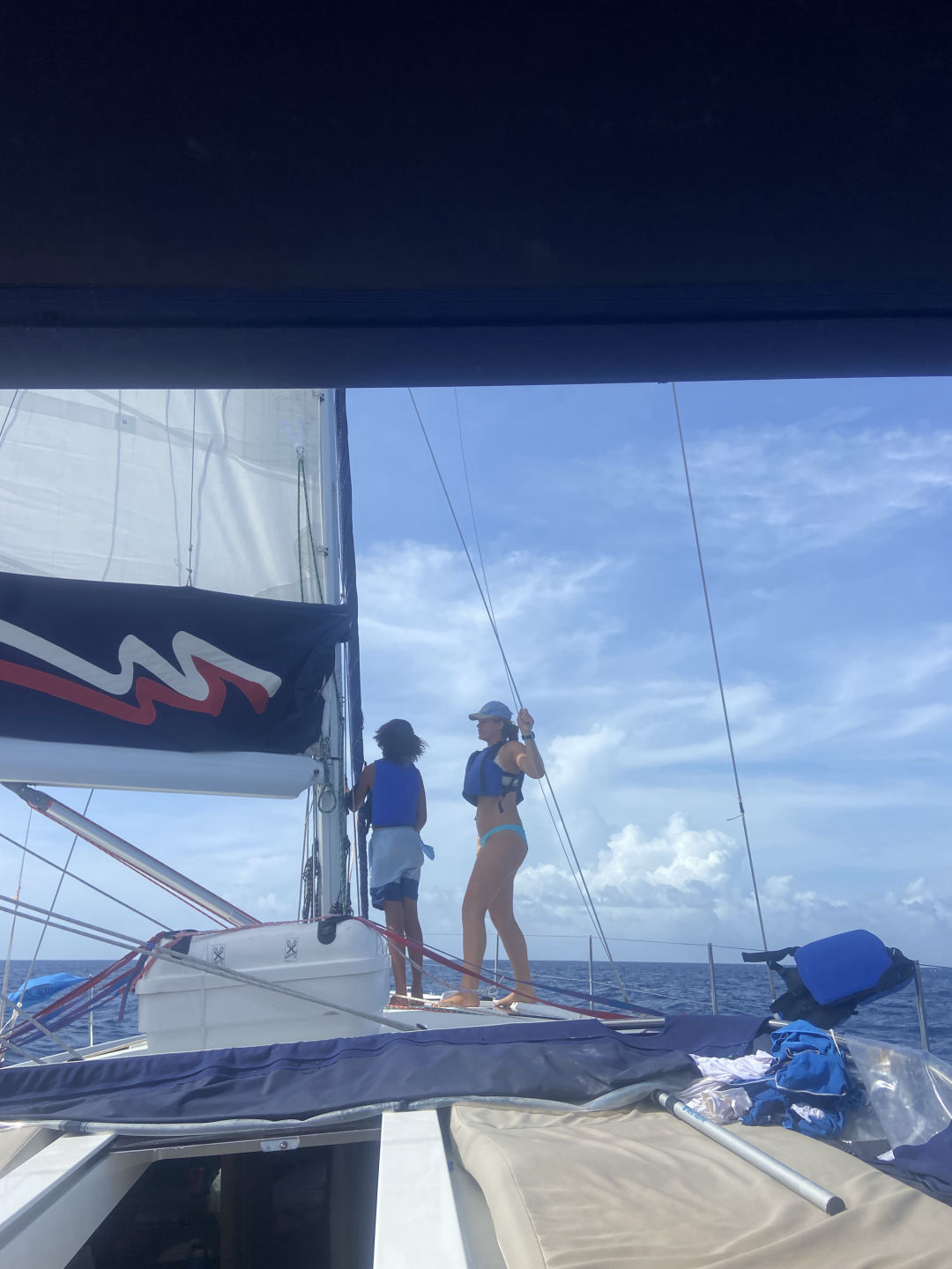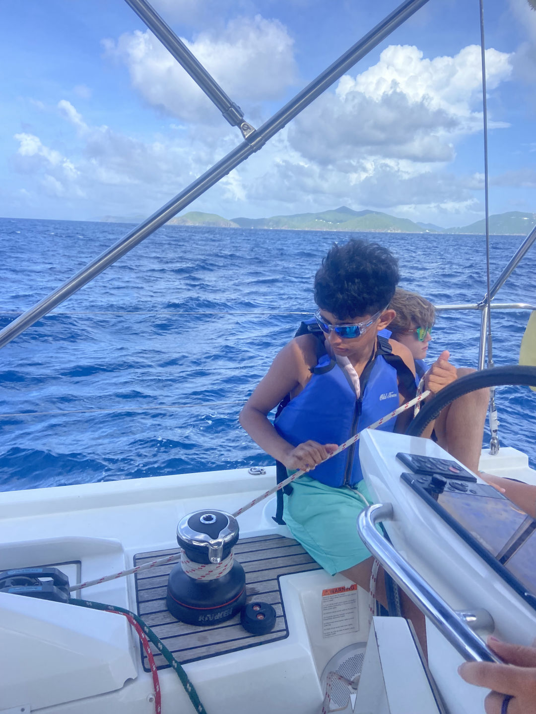 Hello, I am Conrad, and I am the skipper of the day. To start this day, we woke up at around 7 am and had cereal for breakfast. After, we suited up our PFDs to move a few hundred feet to raft with a catamaran by the name of Avizia. This means we connect our boats together using ropes. This is not the first time we have rafted with Avizia, so we were quite friendly. Then we started our last rotation day. A rotation day is when we have set times for different periods. Our first period, for about two hours, was the Chaos period. This included when Amelia and Arden set up the Boom swing, which takes a lot of work. We then set off the paddle boards and the Zests. Me, Arhan, and Cameron all went on the zest and capsized seven times and turtled the zest one time. Then Adnan, Noah, and Jacob went on the zests next.
