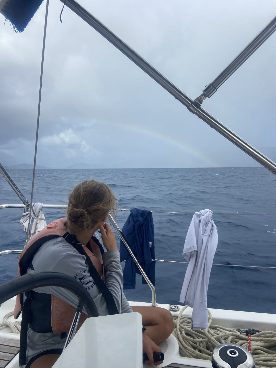 Some people were not exactly fond of it, so some people switched to PBandJ. After lunch, we once again suited up to sail to a new spot called Sandy Spit. Along the way, we practiced Man overboard drills. Don’t worry. We didn’t throw anyone overboard. We used a buoy to act as a person in the water. Everyone on the boat is doing something during the drill. Giles and Caitlin took the helm, while Jacob pulled in the buoy during both of the drills. I furled the jib, which is also a part of the drill. Once we arrived at Sandy Spit, we took a saltwater shower. We then dressed up for a barbecue on a small island. There, staff set up a grill and tables. They served hotdogs, hamburgers, and some sides for a scrumptious dinner for day 12. Now we are sitting down for our final RDP(recreational dive planner) exam. This is our final exam before we receive our Junior open water diver certification. That is a wrap for day 12.