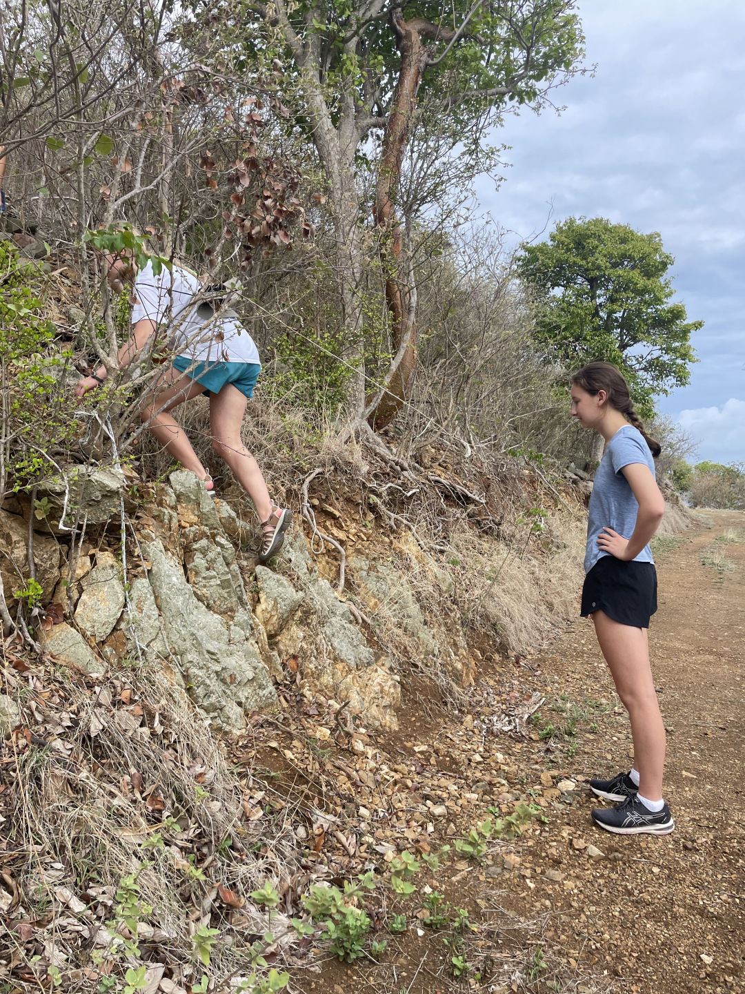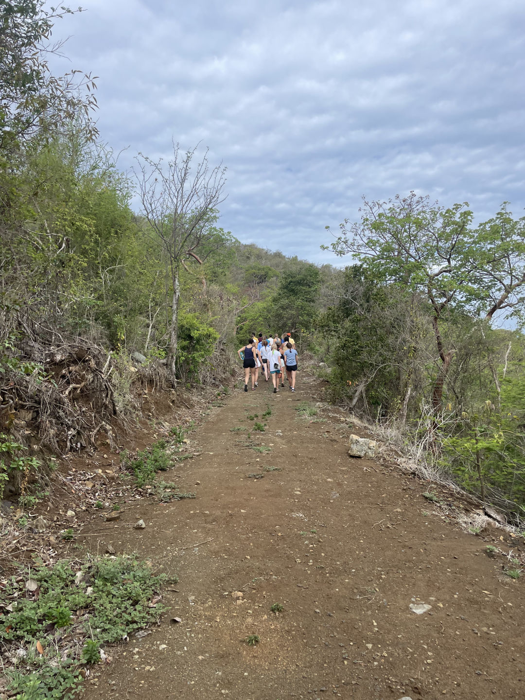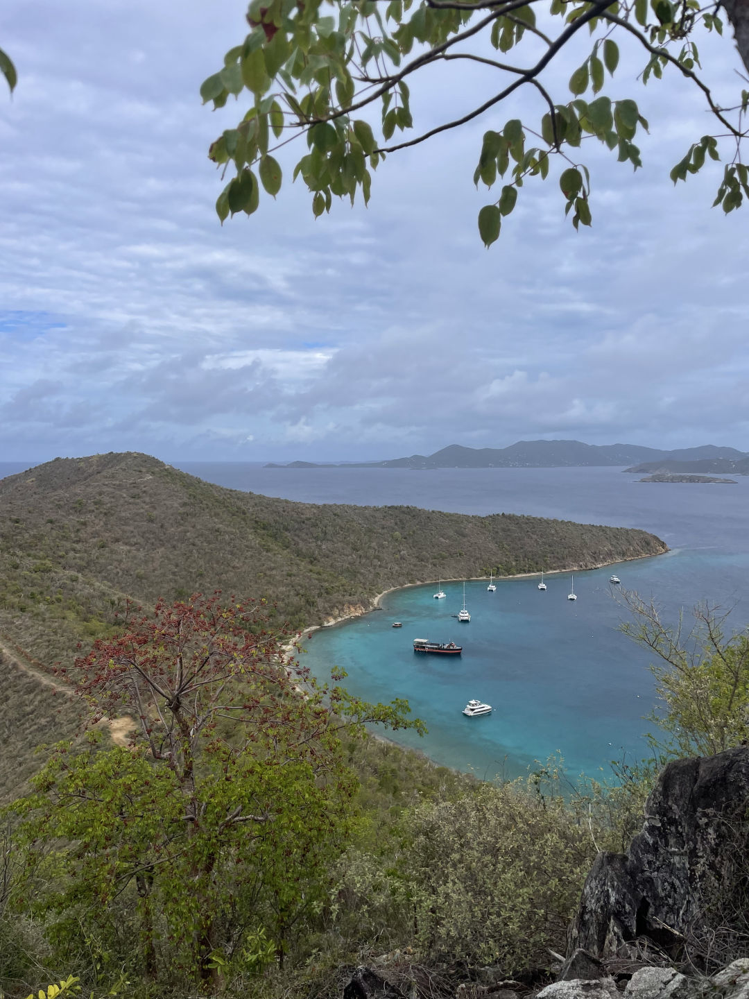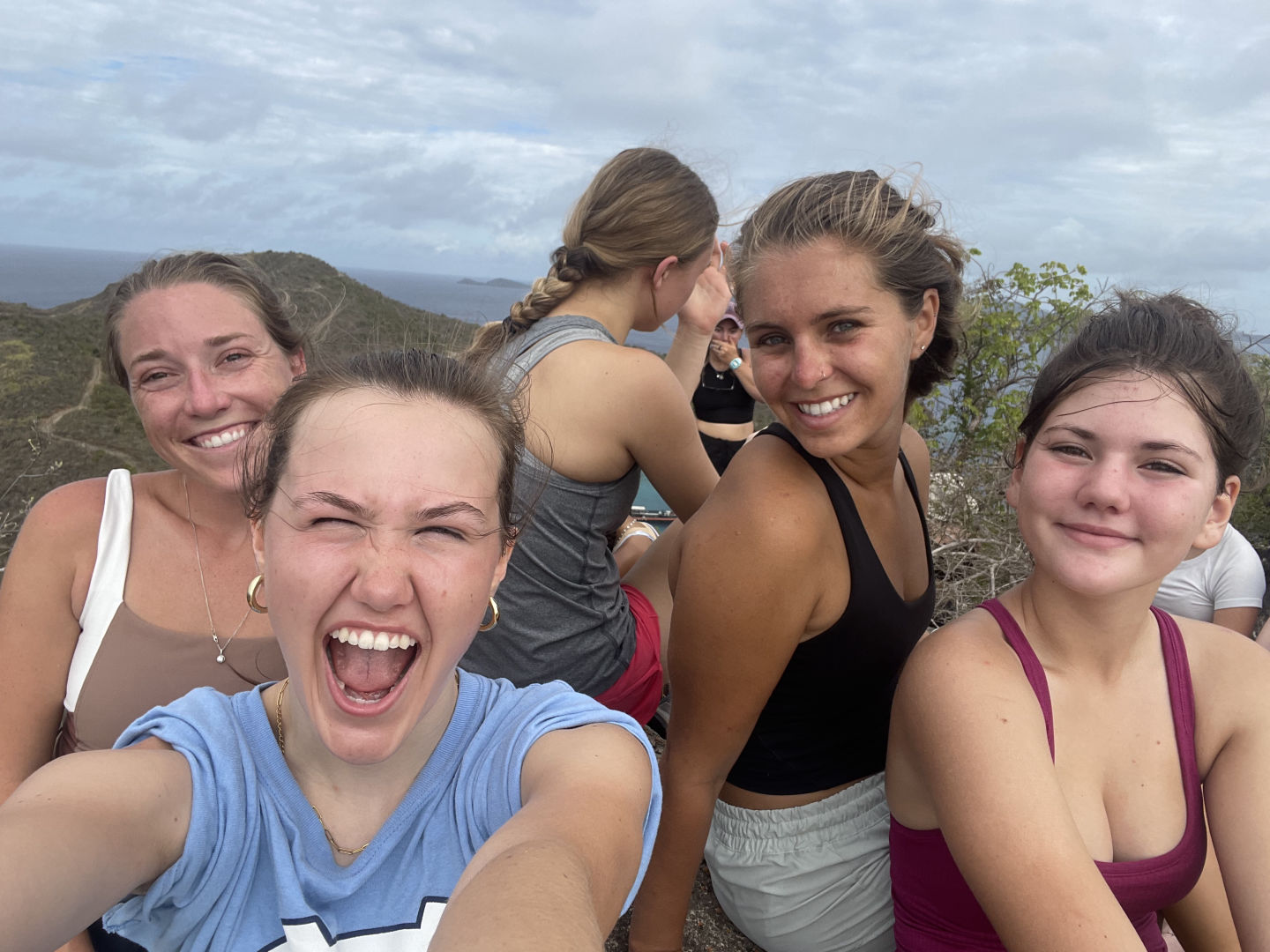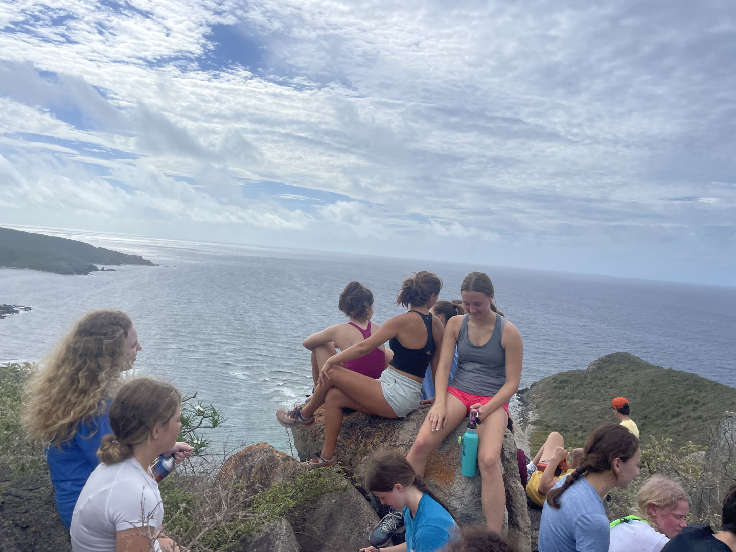 Hi all! We woke up this morning and got dressed to go on a hike up to the peak of an island called Spy Glass Hike, which was very hot and humid, but was definitely worth the scrapes and sweat for the amazing view. After that, we put on our life jackets and settled in for a 3-hour trip to Virgin Gorda. Some people took naps or read while others listened to an extensive playlist of songs to pass the time. When we arrived, we dropped anchor and made lunch (sandwiches!) and then listened to Krisz’s talk on sailing, which included a song to remember the different places wind can hit the sails. We then swam near the boat, some of us practicing our flips and dives off the side, and finally finished the day with brownies and a movie.