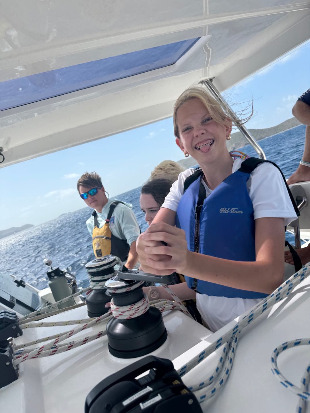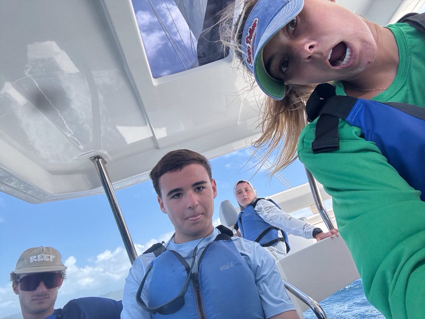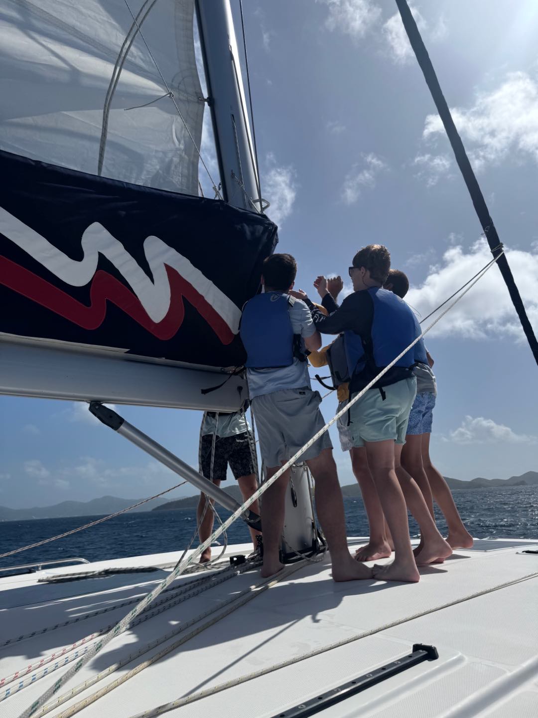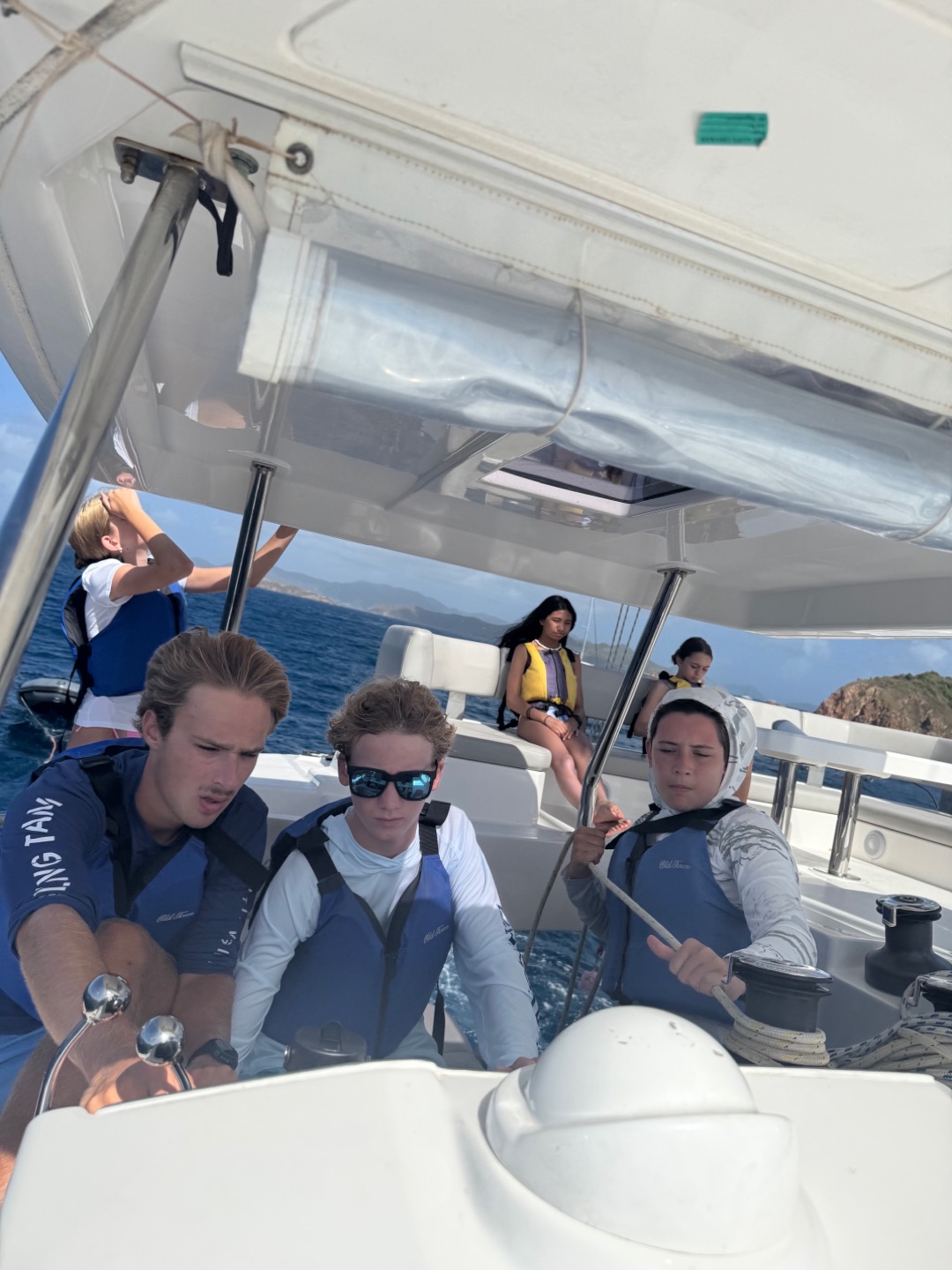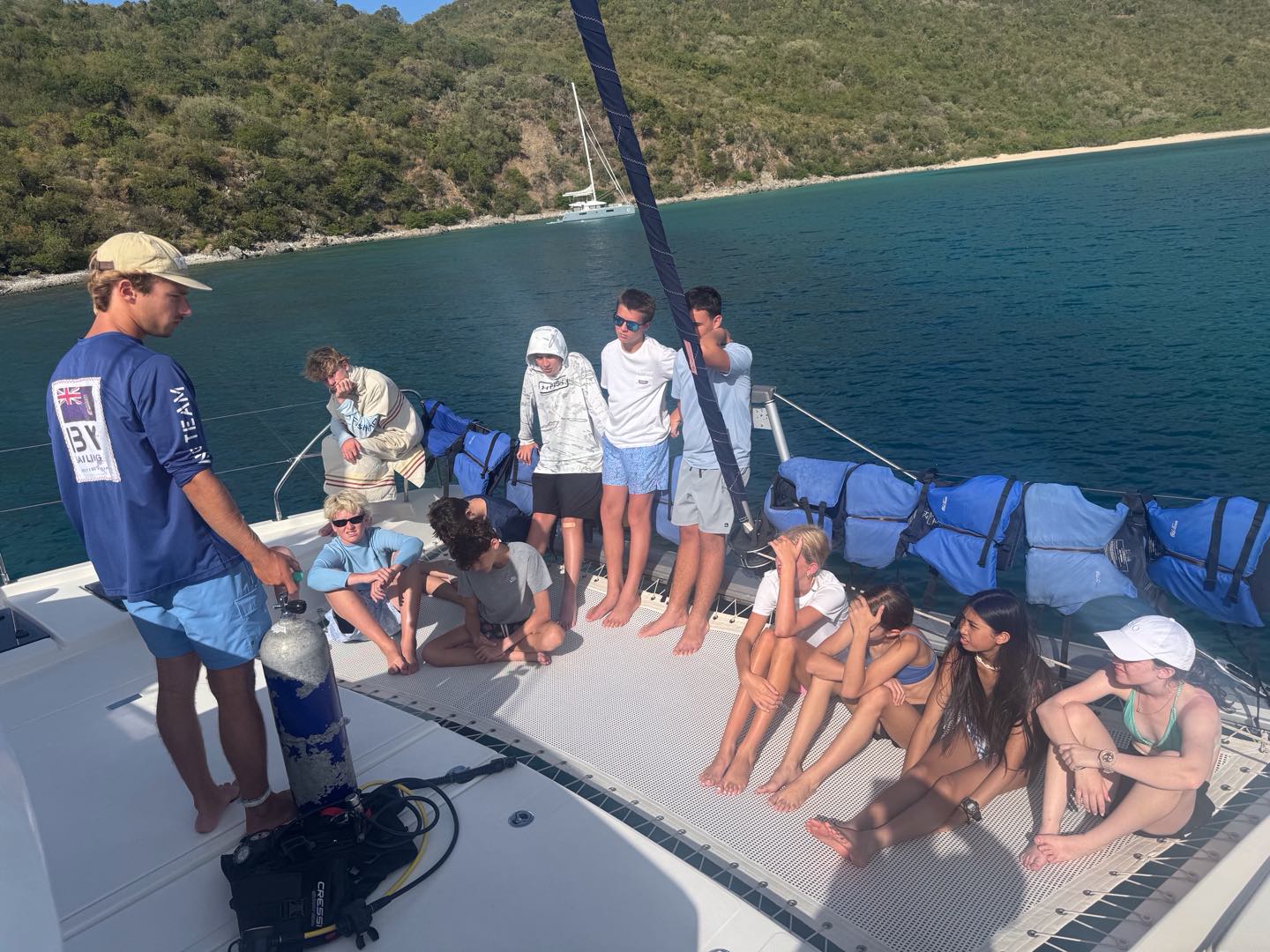 Today we all woke up at like 7 am to really awesome and amazing music that Margaret played. She is so cool. After, we all got dressed i talked to jack, Brooks, levi, Liam, Henry, Charlie and then iodhan as we ate breakfast witch was Pancakes!!, after that we learned our jobs of the day and cleaned up, then we got our life vests on for a 4 hour sail to a island called cooper island for lunch. After we ate, we got to snorkel around the boat, and we saw sooooo many jellyfish, it was so cool. Then, we sailed for another 2 hours to Mountain Point, where we will be staying for the night. While we were sailing, most of us played Uno, and Teagan lost, and it was really funny. We had dinner and are going to sleep, but during this long trip in between raising the sail and steering the boat me(Austin),Liam, lio, Nikki, tegan, and aodhan us sat down for a intense game of uno and levi brooks and jack went to the front and got blasted with water, once we got here we learned to put together our scuba gear and went for a swim, after we showered we ate alfredo with garlic bread and hotdogs :D, and after we will have have our second dive chat and quiz.
