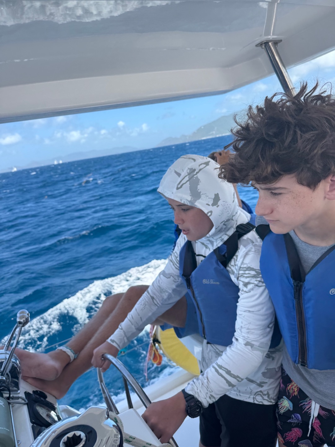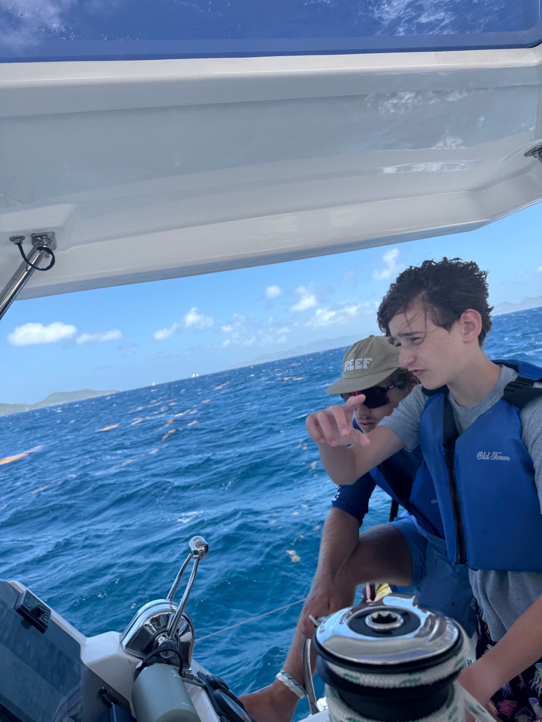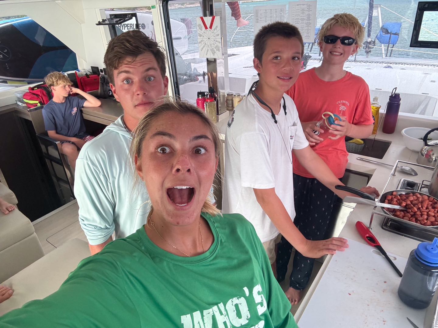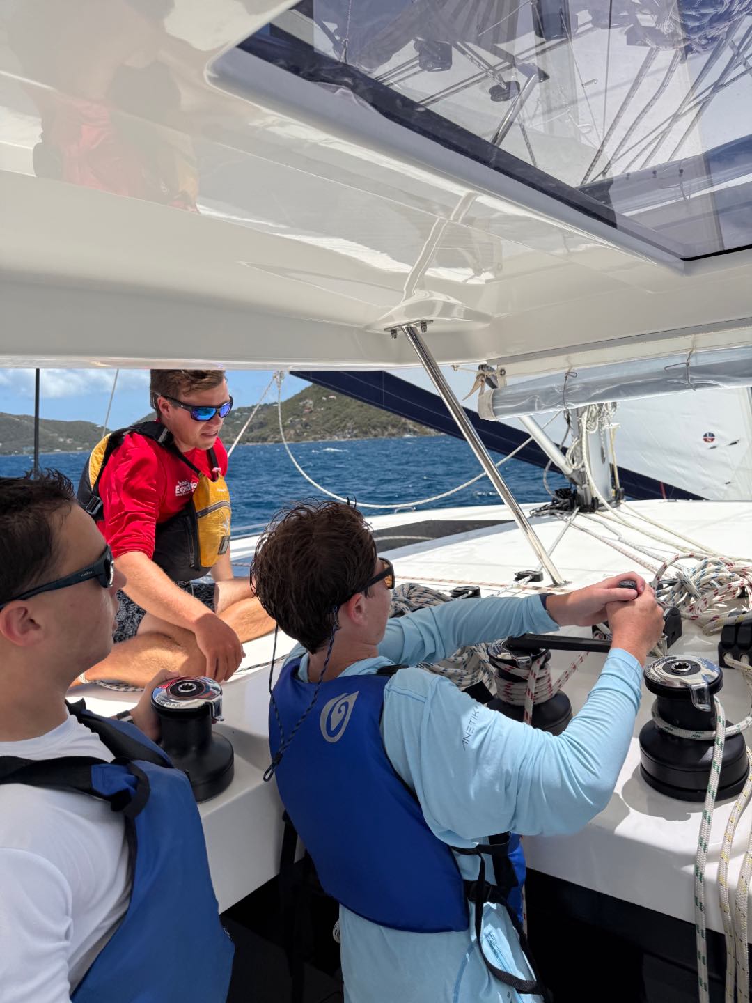 Today we all woke up at like 7 am to really awesome and amazing music that Margaret played. She is so cool. After, we all got dressed i talked to jack, Brooks, levi, Liam, Henry, Charlie and then iodhan as we ate breakfast witch was Pancakes!!, after that we learned our jobs of the day and cleaned up, then we got our life vests on for a 4 hour sail to a island called cooper island for lunch. After we ate, we got to snorkel around the boat, and we saw sooooo many jellyfish, it was so cool. Then, we sailed for another 2 hours to Mountain Point, where we will be staying for the night. While we were sailing, most of us played Uno, and Teagan lost, and it was really funny. We had dinner and are going to sleep, but during this long trip in between raising the sail and steering the boat me(Austin),Liam, lio, Nikki, tegan, and aodhan us sat down for a intense game of uno and levi brooks and jack went to the front and got blasted with water, once we got here we learned to put together our scuba gear and went for a swim, after we showered we ate alfredo with garlic bread and hotdogs :D, and after we will have have our second dive chat and quiz.