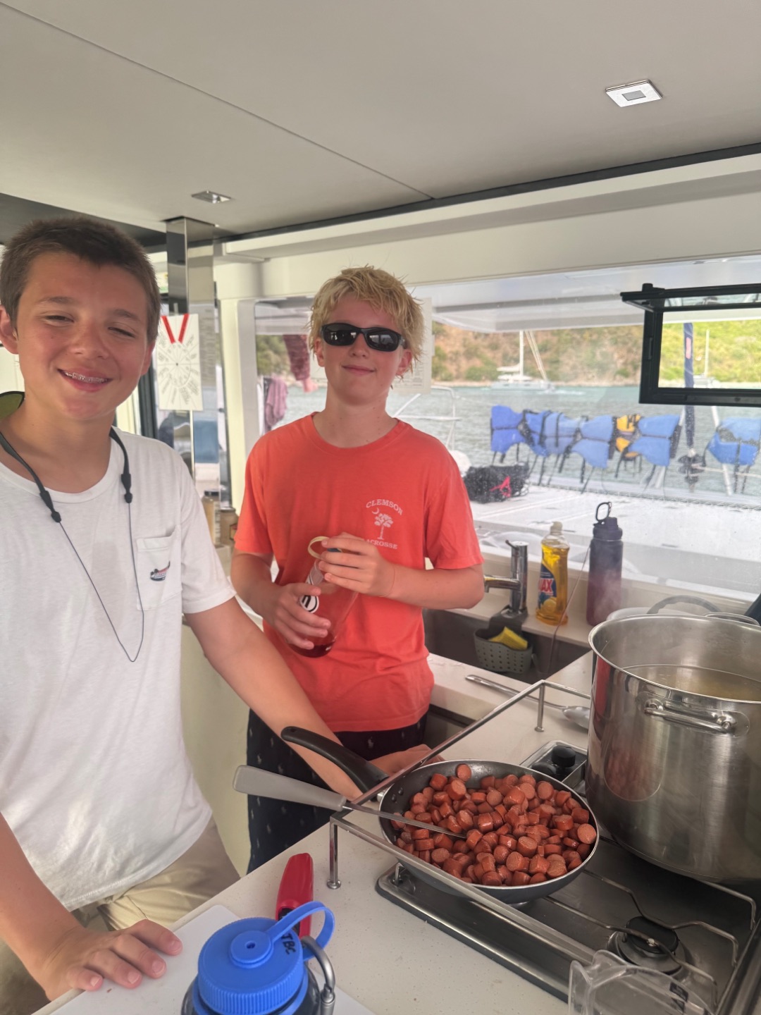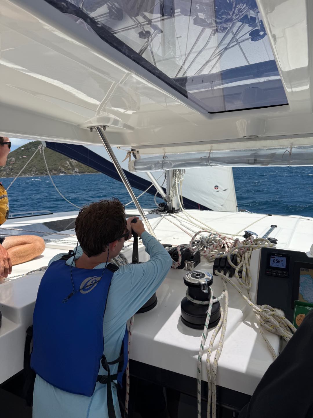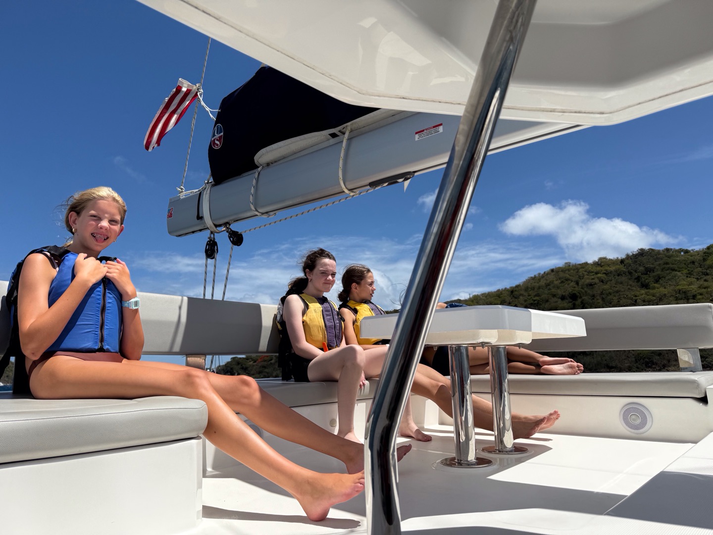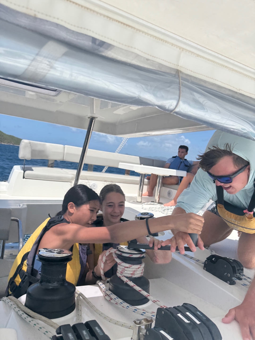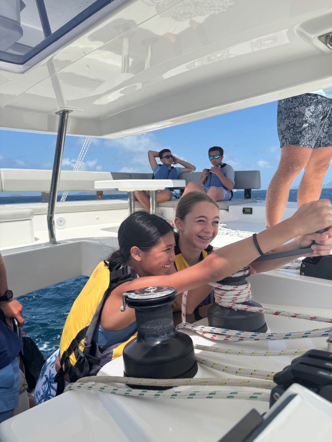 Today we all woke up at like 7 am to really awesome and amazing music that Margaret played. She is so cool. After, we all got dressed i talked to jack, Brooks, levi, Liam, Henry, Charlie and then iodhan as we ate breakfast witch was Pancakes!!, after that we learned our jobs of the day and cleaned up, then we got our life vests on for a 4 hour sail to a island called cooper island for lunch. After we ate, we got to snorkel around the boat, and we saw sooooo many jellyfish, it was so cool. Then, we sailed for another 2 hours to Mountain Point, where we will be staying for the night. While we were sailing, most of us played Uno, and Teagan lost, and it was really funny. We had dinner and are going to sleep, but during this long trip in between raising the sail and steering the boat me(Austin),Liam, lio, Nikki, tegan, and aodhan us sat down for a intense game of uno and levi brooks and jack went to the front and got blasted with water, once we got here we learned to put together our scuba gear and went for a swim, after we showered we ate alfredo with garlic bread and hotdogs :D, and after we will have have our second dive chat and quiz.