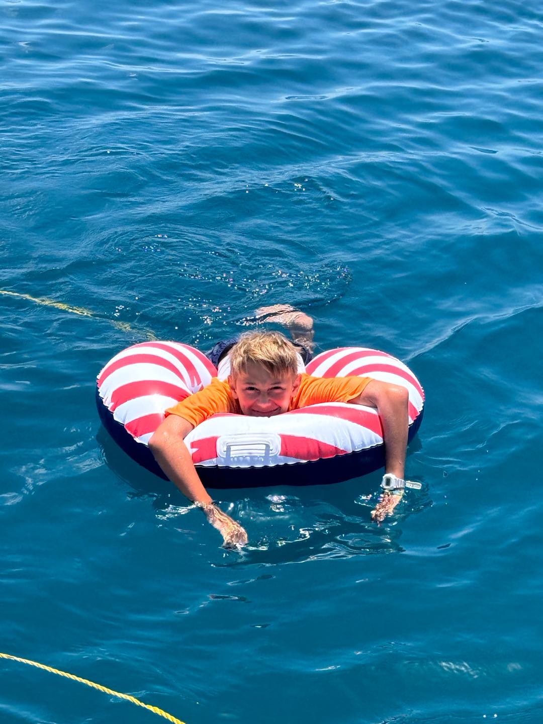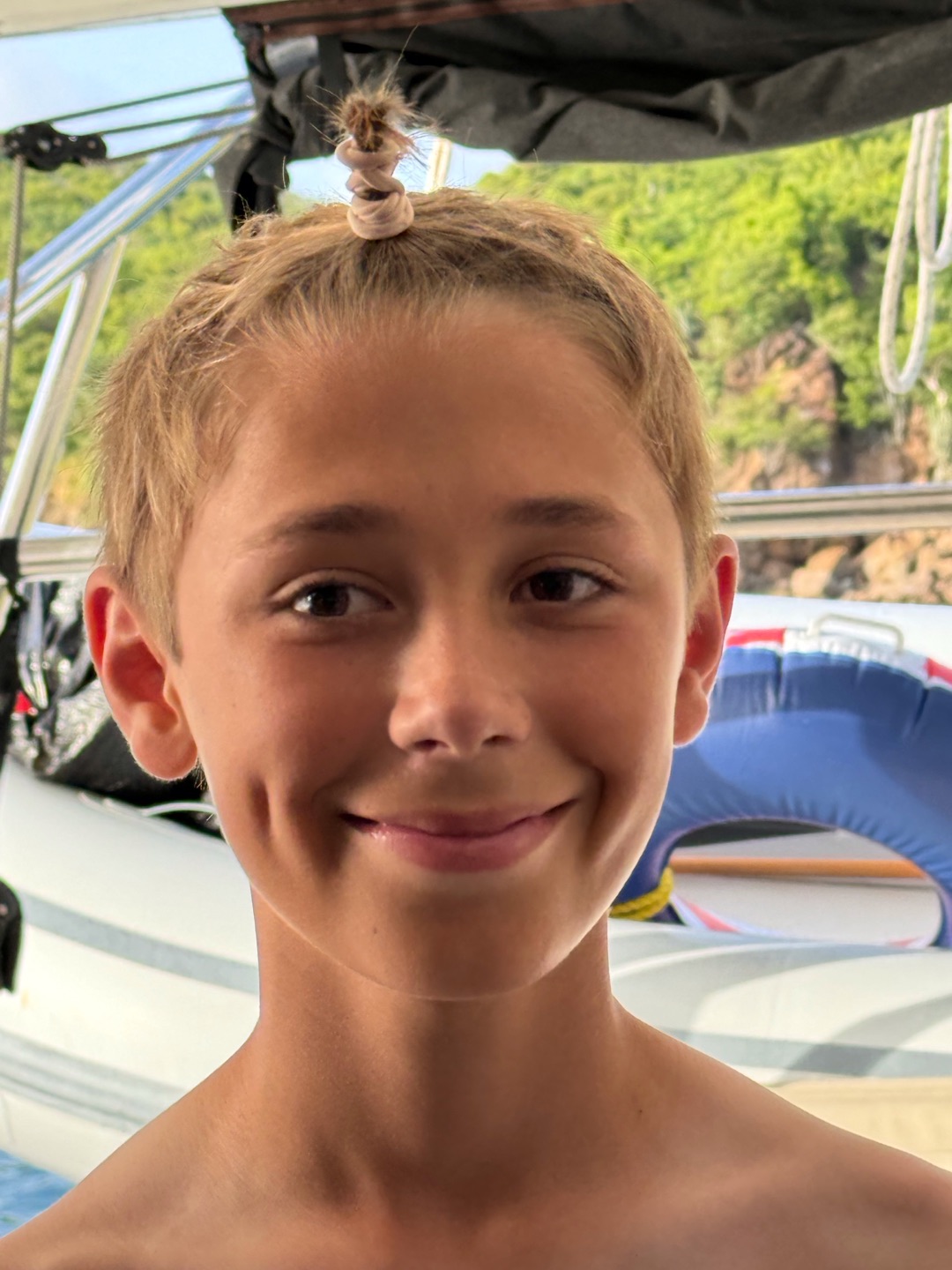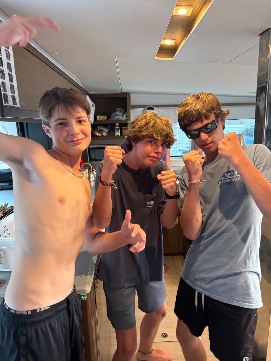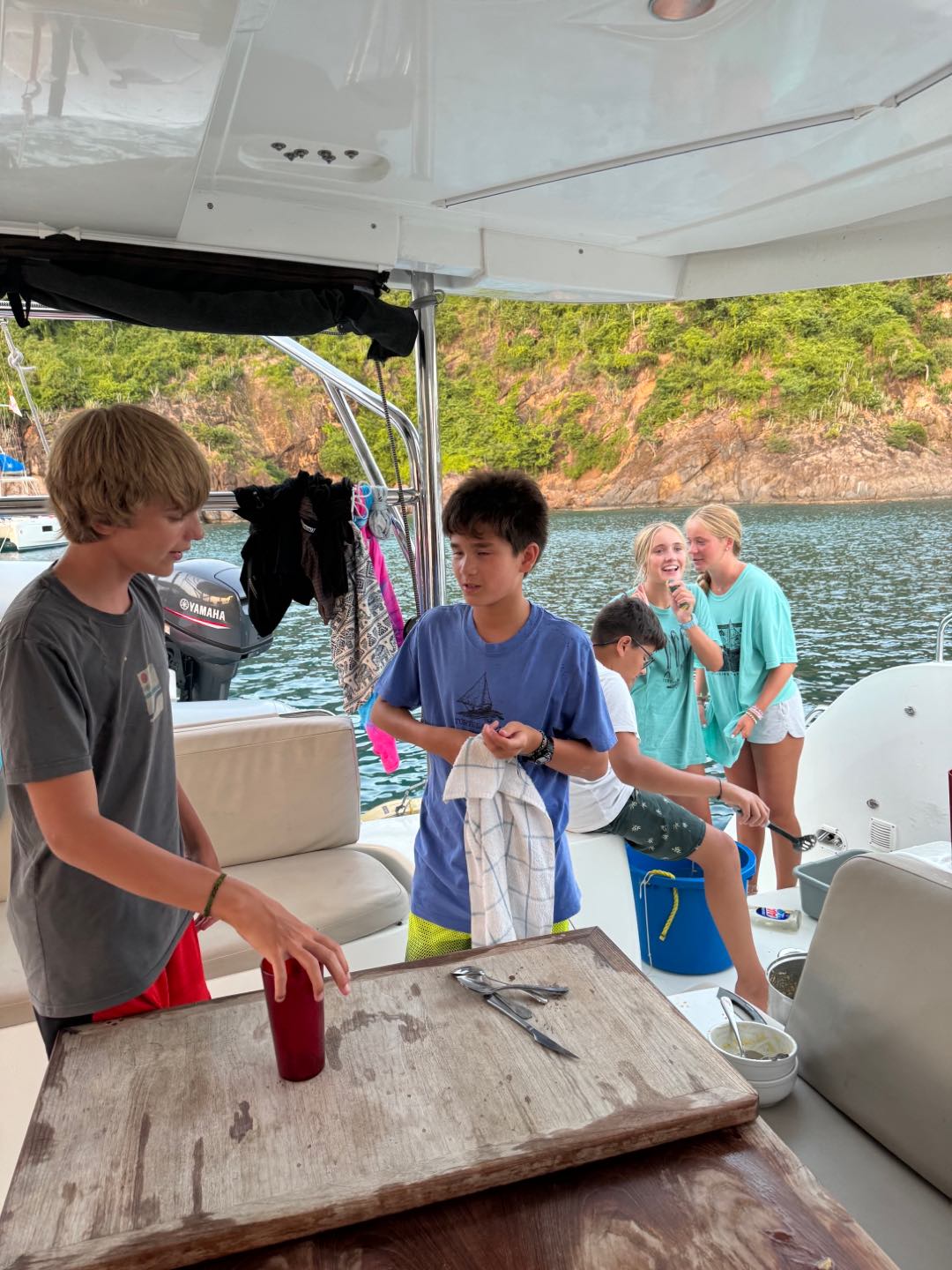 Today, we got to sleep in until 7:30 am, which was really good because the past two days, I have been waking up extremely early to prank other boats, so I finally, after two days, got a really good sleep. Today was a really relaxing but just as fun. In the morning, the gopher, Liam, took out bagels, butter, cream cheese, and yogurt for breakfast while the counselors went to a meeting. We all decided to surprise our counselors and clean the boat thoroughly because it was getting really messy. Lawson and Tomas scrubbed the floor while Graham told everyone to get their clothes off the lines so we could be organized. While Tomas was cleaning the boat, the deckie bucket fell into the water, but Tomas saved the day and jumped in after the bucket. The chefs, Alex and Violet, wiped down the counters and tables. The counselors were very proud of how clean our boat was, but when they returned from the staff meeting, we got really sad news. MaLahku informed us that we were banned from doing any more pranks, which was really sad because Daisy and I were planning more pranks we could do on other boats. On the bright side, that means our pranks were the best. We left the island we were at after breakfast and sailed off to Trellis Town. We got there at 10:45, and we stayed there for three hours. The first thing we did when we got to town was that Alex, Daisy, Devyn, Hayes, Lawson, and I went to get sodas at a restaurant. After, we went to the supermarket to stalk up on snacks. Everyone got Chips Ahoy, and Reed got a pack for Margret (who is obsessed with cookies), which was really thoughtful. Later I got lunch with Violet, Antonio and Alex. There, we got quesadillas, which were really good, but the chicken had a weird texture. The last thing we did was go to a store in town, and almost everyone got similar/matching shirts. They are really cute. Once it was 1:45 pm, we returned to our boat and sailed off to another place. While we sailed, Violet took a nap. I read my book, and half of the boat was playing poker. They “gambled” with chips ahoy and Pringles. Antonio dominated and beat everyone by far. It was really fun. Once we arrived, we anchored, and our chefs, Violet and Alex, started preparing dinner, which was beef stroganoff. While they made dinner, Tony played music, and Lawson and Hayes danced. Dinner was really good, and Reed and Graham said it was one of the best dinners. We had a squeeze and are currently cleaning up. Hopefully, we don’t get pranked because we can’t prank any boats back. It’s ok, though, because we will probably be playing Calabria. Time is going really fast, so hopefully, it slows down because everyone’s having a lot of fun, and I don’t want summer to end! If you’re seeing this, I miss you a lot, Mom, Dad, and Mora, and I am excited to see you all
