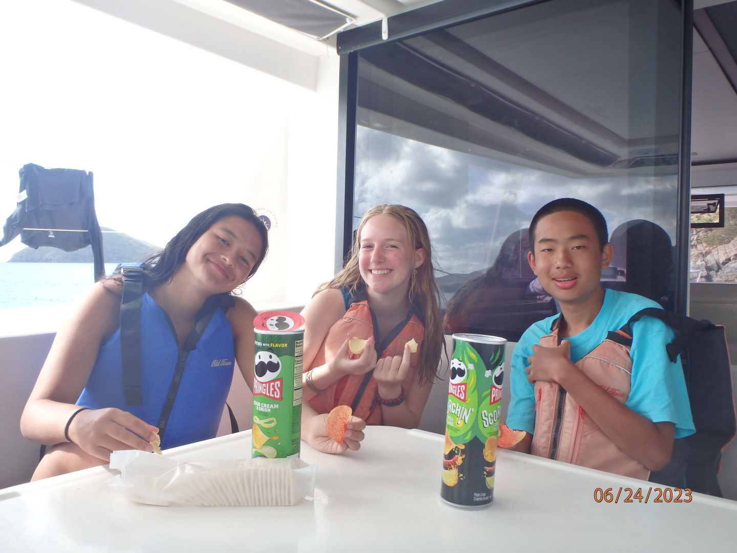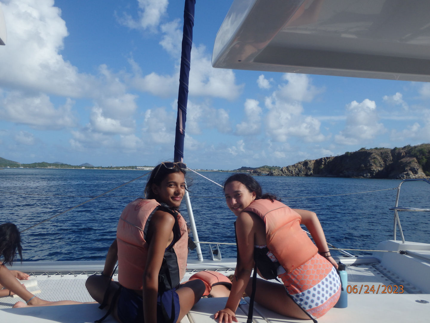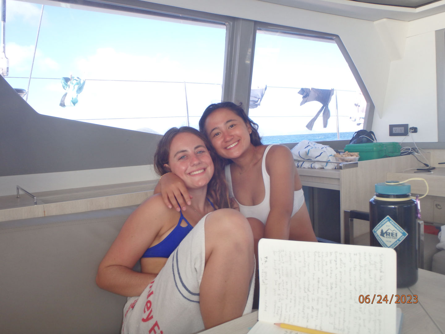 Everyone around the boat is doing something different as I write this… Ella, Chava, Azi, and Lindsey are conversing. Adele, Zoe, Maeve, Gavin, Delphine, and Samaara are o the roof listening to music, and Sanaah, Jess, and Krisz are in their cabins getting ready for bed. Today was a rather “chill” day (as Krisz stated at dinner). We woke up rather late today (compared to most other days on this trip) and had a very long and slow breakfast. After said eating the early morns meal, we set sail (not literally) and went underway for the island of Tortola. As we anchored the boat near a beach, we ate lunch (a kind of soup that I don’t know the name of), which was made by our lovely chef Maeve and sous chef Azi. After the said meal, our deckies Gary and Zoe cleaned up (guess what, the deck), and we all had a large scrub down of the boat (we cleaned up all the collected dirt, personal items, and our bedrooms) so that Krisz could make sure the boat was clean, and let us get to turtle tagging. After confirming with us that everything was clean, we went to the rocks near the beach to look for turtles, to no avail. We spotted a stingray and a few schools of fish and were constantly surrounded by (what I was told by Jess) a kind of zooplankton, which were rather squishy when you held them. After said sad failing of the turtle tagging, we came back to the boat, pulled up the anchor, and made our way to the island of Trellis Bay, where we then connected ourselves to a mooring ball, took our saltwater showers, and ate dinner (again prepared by our chefs Maeve and Azi) which was a delicious Caesar salad! After we were done eating, Gavin, Samaara, Sanaah, Delphine, and I cleaned the dishes, and now we are back to where we started! We have been having a great time here so far and are looking forward to so much more! We miss you and want you to know that we are all having the time of our lives over here! We love you all!