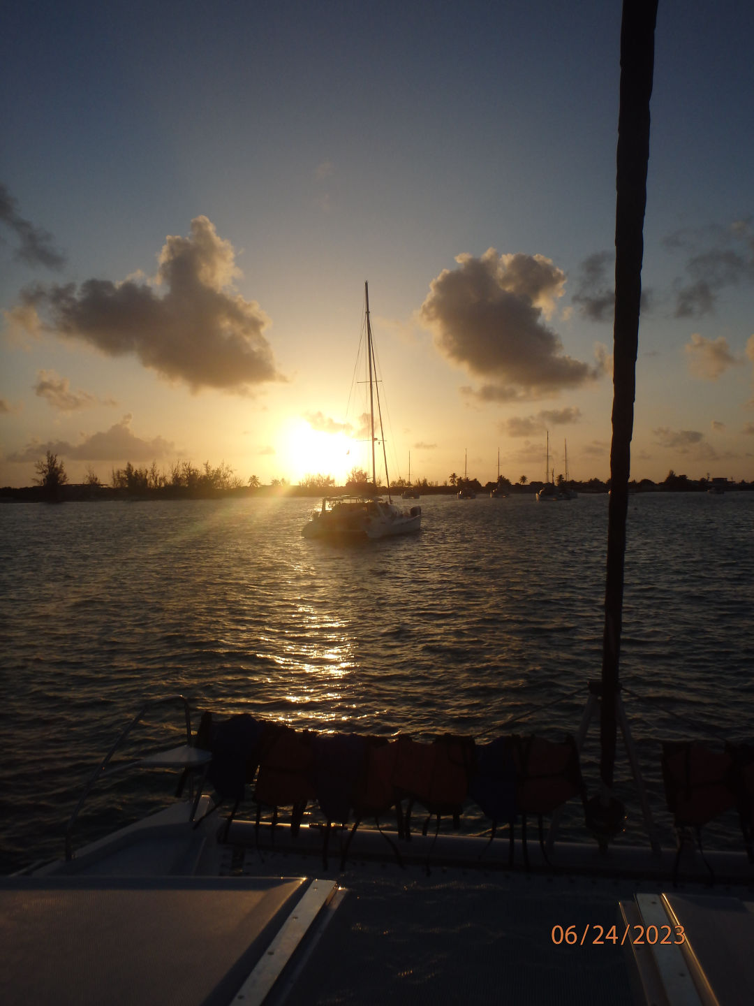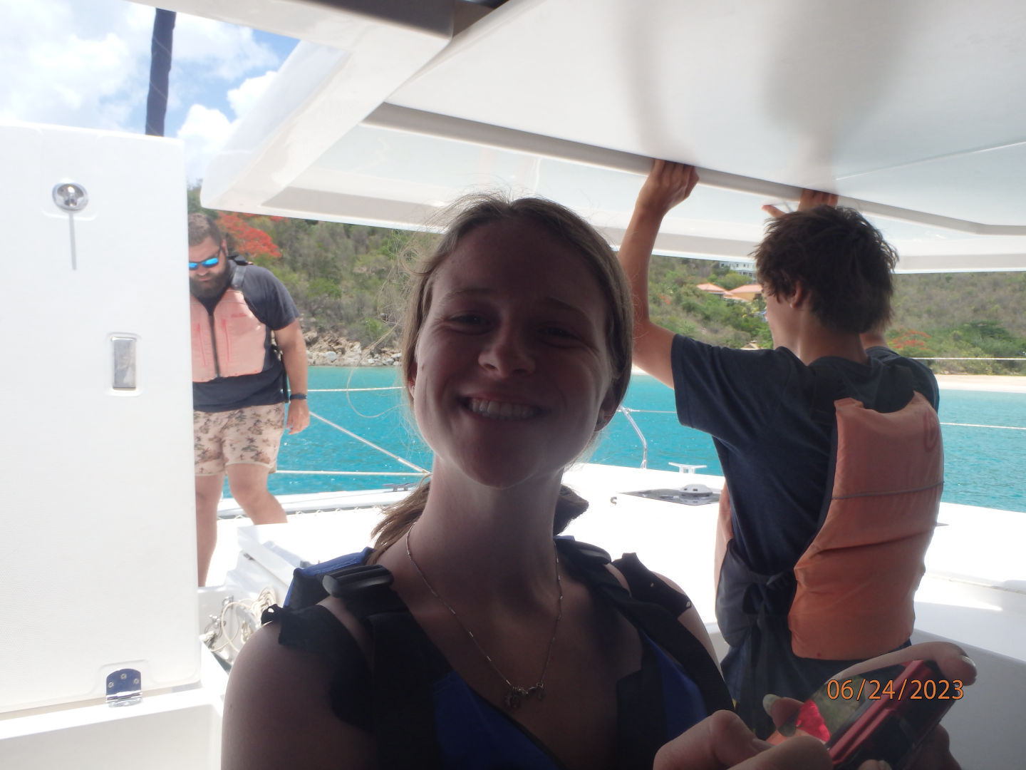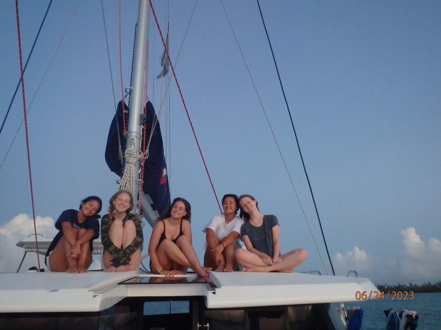 Everyone around the boat is doing something different as I write this… Ella, Chava, Azi, and Lindsey are conversing. Adele, Zoe, Maeve, Gavin, Delphine, and Samaara are o the roof listening to music, and Sanaah, Jess, and Krisz are in their cabins getting ready for bed. Today was a rather “chill” day (as Krisz stated at dinner). We woke up rather late today (compared to most other days on this trip) and had a very long and slow breakfast. After said eating the early morns meal, we set sail (not literally) and went underway for the island of Tortola. As we anchored the boat near a beach, we ate lunch (a kind of soup that I don’t know the name of), which was made by our lovely chef Maeve and sous chef Azi. After the said meal, our deckies Gary and Zoe cleaned up (guess what, the deck), and we all had a large scrub down of the boat (we cleaned up all the collected dirt, personal items, and our bedrooms) so that Krisz could make sure the boat was clean, and let us get to turtle tagging. After confirming with us that everything was clean, we went to the rocks near the beach to look for turtles, to no avail. We spotted a stingray and a few schools of fish and were constantly surrounded by (what I was told by Jess) a kind of zooplankton, which were rather squishy when you held them. After said sad failing of the turtle tagging, we came back to the boat, pulled up the anchor, and made our way to the island of Trellis Bay, where we then connected ourselves to a mooring ball, took our saltwater showers, and ate dinner (again prepared by our chefs Maeve and Azi) which was a delicious Caesar salad! After we were done eating, Gavin, Samaara, Sanaah, Delphine, and I cleaned the dishes, and now we are back to where we started! We have been having a great time here so far and are looking forward to so much more! We miss you and want you to know that we are all having the time of our lives over here! We love you all!