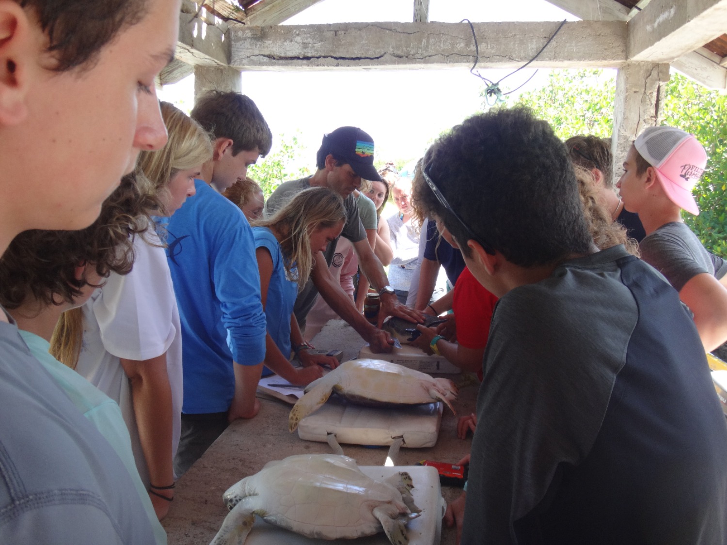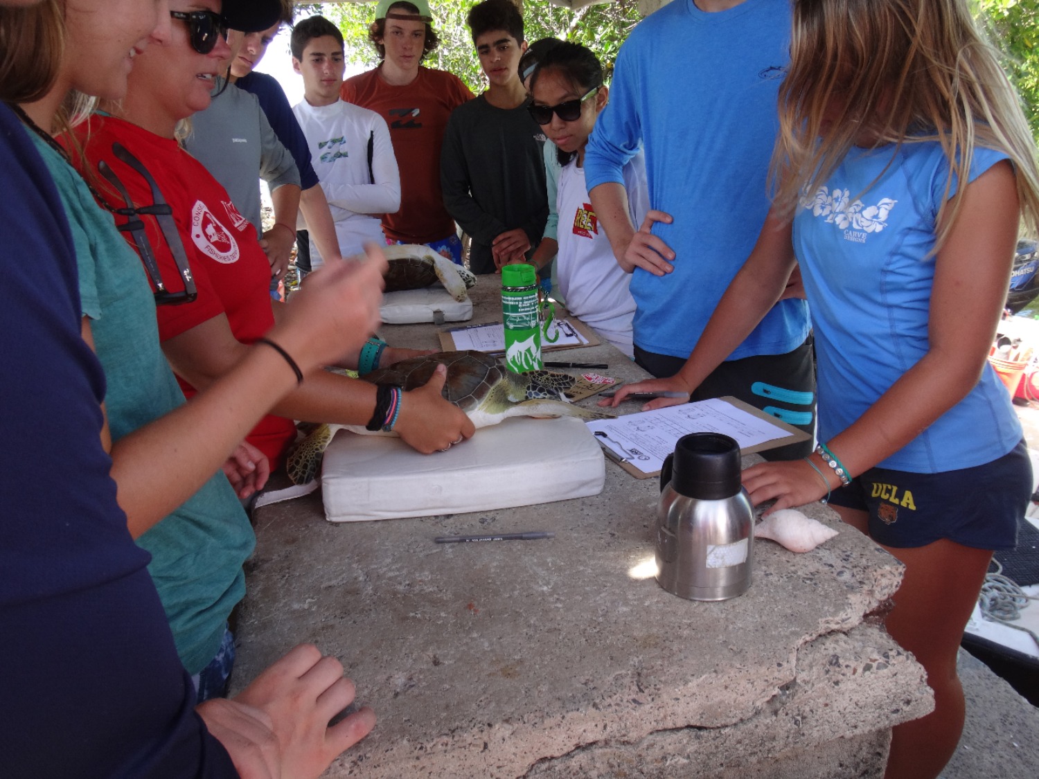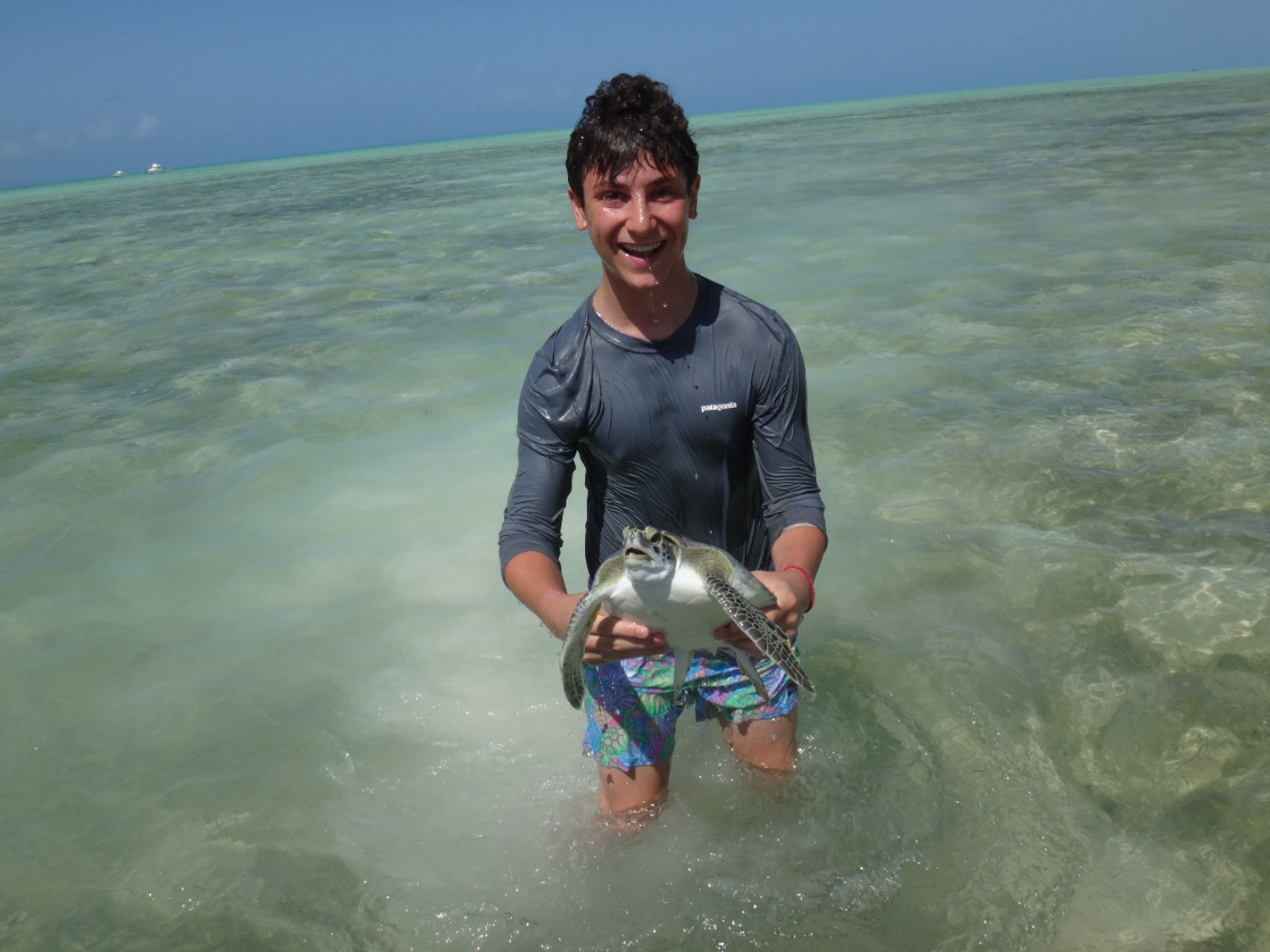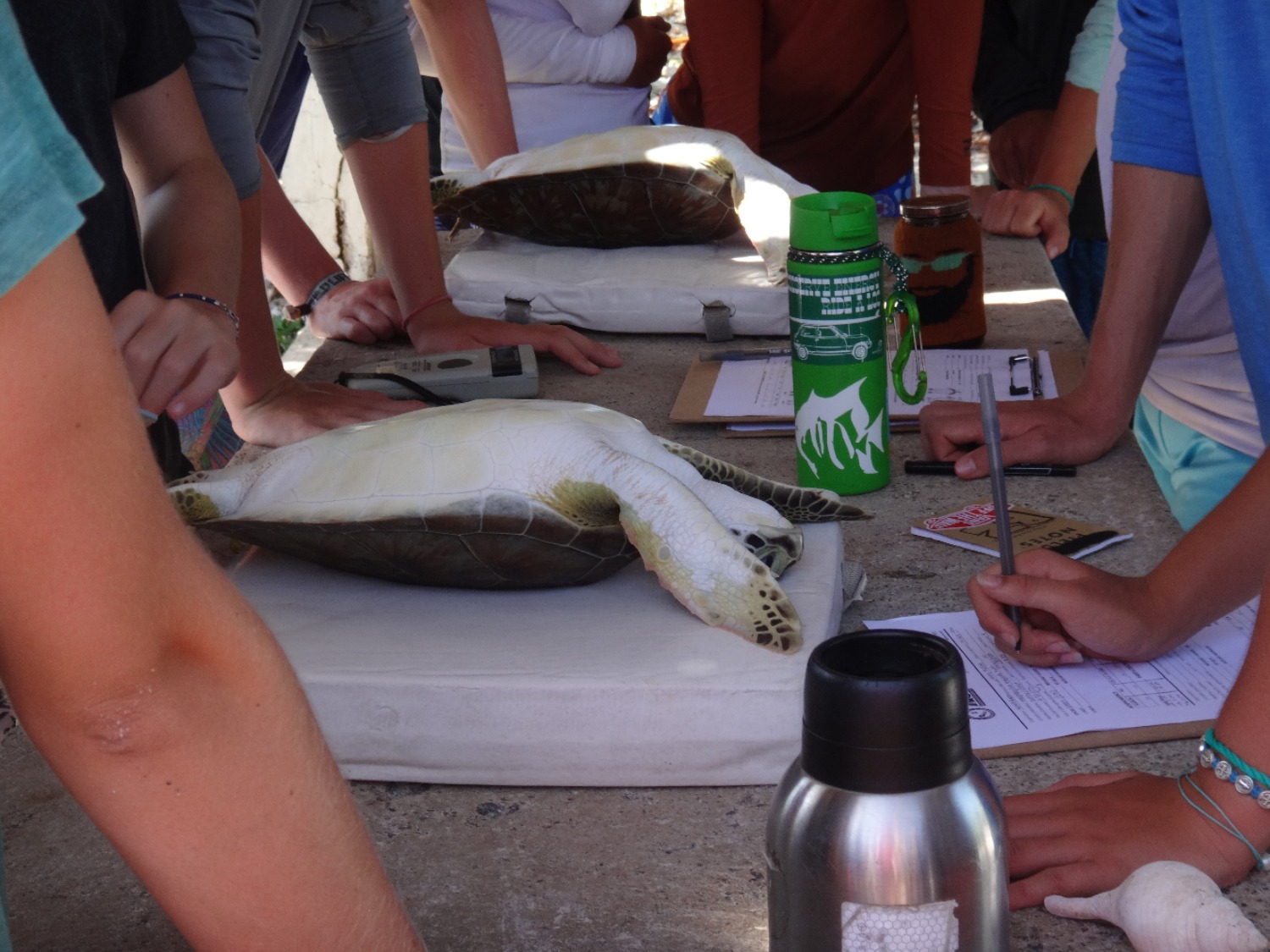 So today was a full day of turtles. Our day began with Jules going around yelling “Turtles, Turtles, Turtles!” while jumping up and down. Once we got to the fisherman’s wharf to turtle tag, we had to be extremely quiet. A little while after we got there, a group of people and I got in the small boat and headed out to catch a turtle. Five to ten minutes later, we came back with a turtle that we later named Jaws. His name came from the bite mark that looks as if could be from a shark on his left lower shell. After we brought him back, we did a bunch of different measurements and tagged him technically three times, one of each of his fins and a “pit tag”, which is in his neck. Very surprisingly, he didn’t flinch until we had to put him back in the water. Jaws was the “chillest” turtle ever and had a great day with him and all the Lifeworks family.