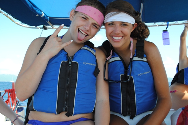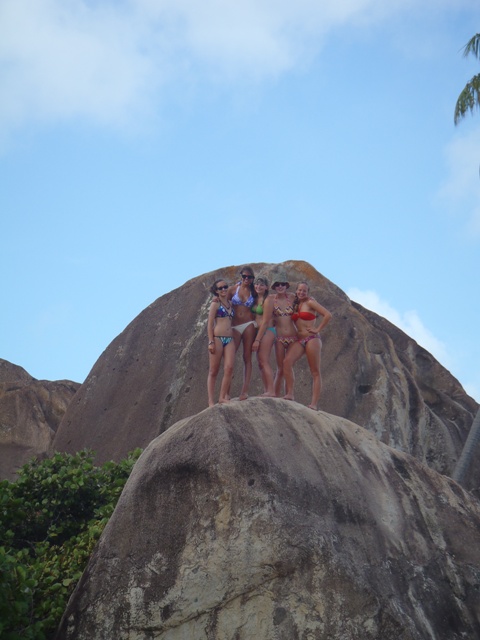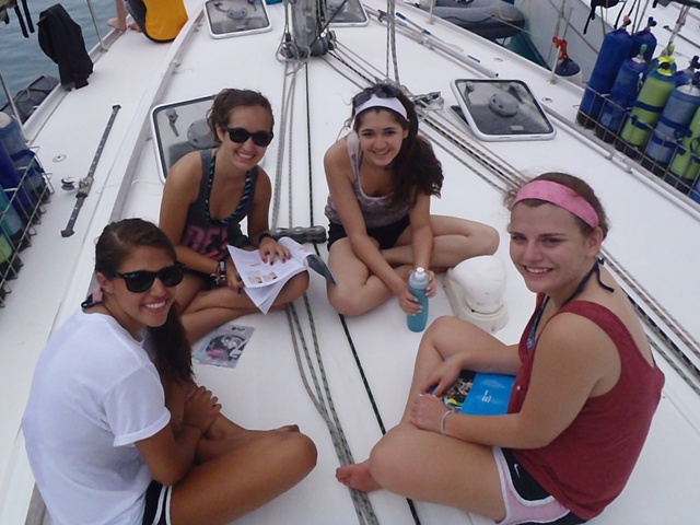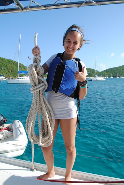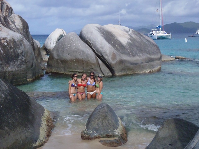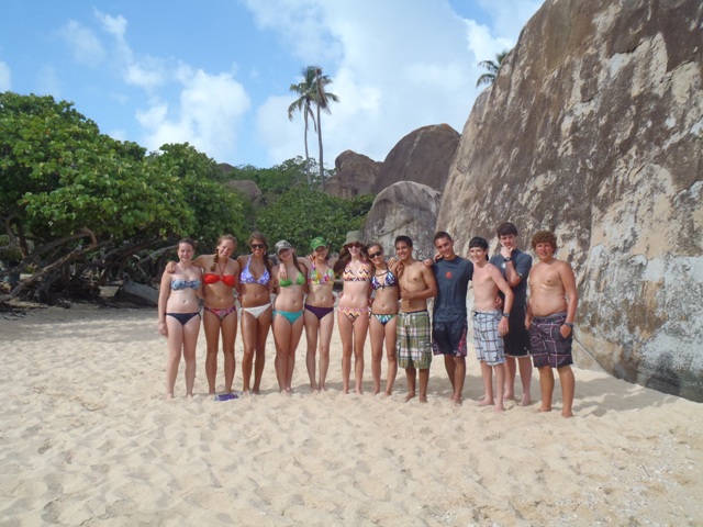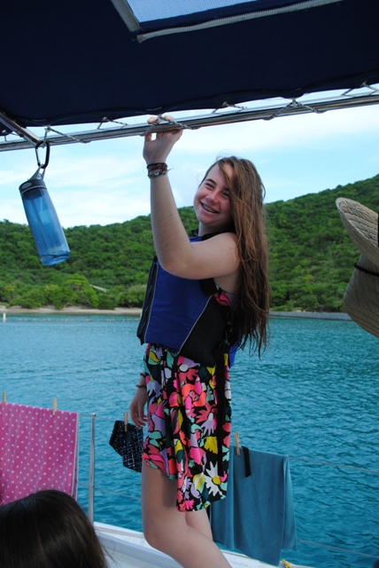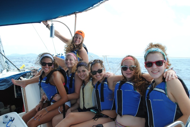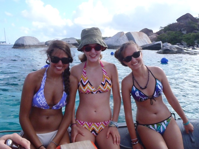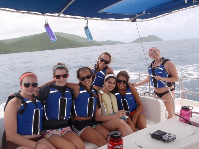 Today we woke up and had an oatmeal breakfast accompanied by a beautiful sunrise. Soon after we set sail for the Baths- a gorgeous place with cool rocks that we climbed and played on. In the beach, we even saw a stingray! After playing for two hours, we re-boarded the ship and set sail for the Spanishtown marina where we were able to go on land. Eating a nice meal in a restaurant was followed by shopping in the local shops and grocery store (we stocked up on snacks). We spent two hours there as well before sailing to Vixen Point. During the trip, we all took showers which made us all feel squeaky clean. For dinner, we had veggie burgers and a delicious, nutritious salad. Tonight we are rafted near our fellow AQ boats and will get in some bonding time! Can’t wait for the adventures that await us tomorrow.