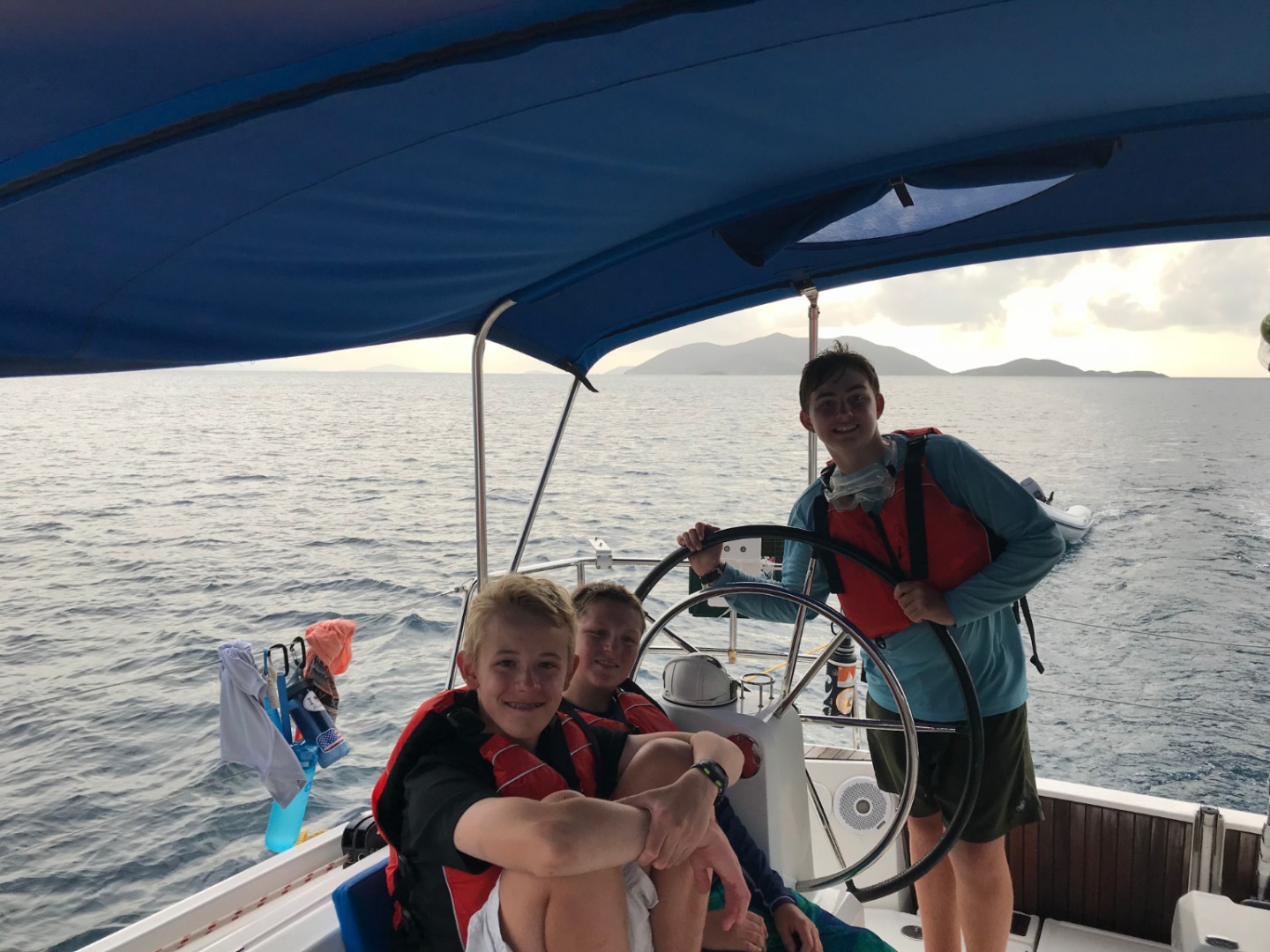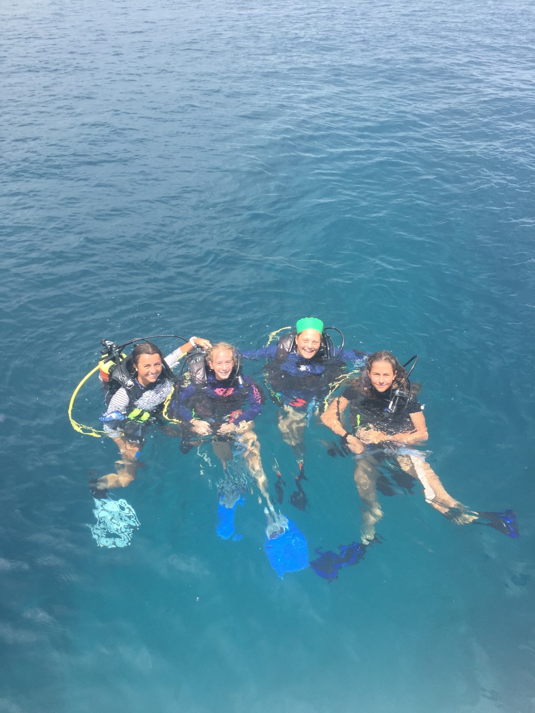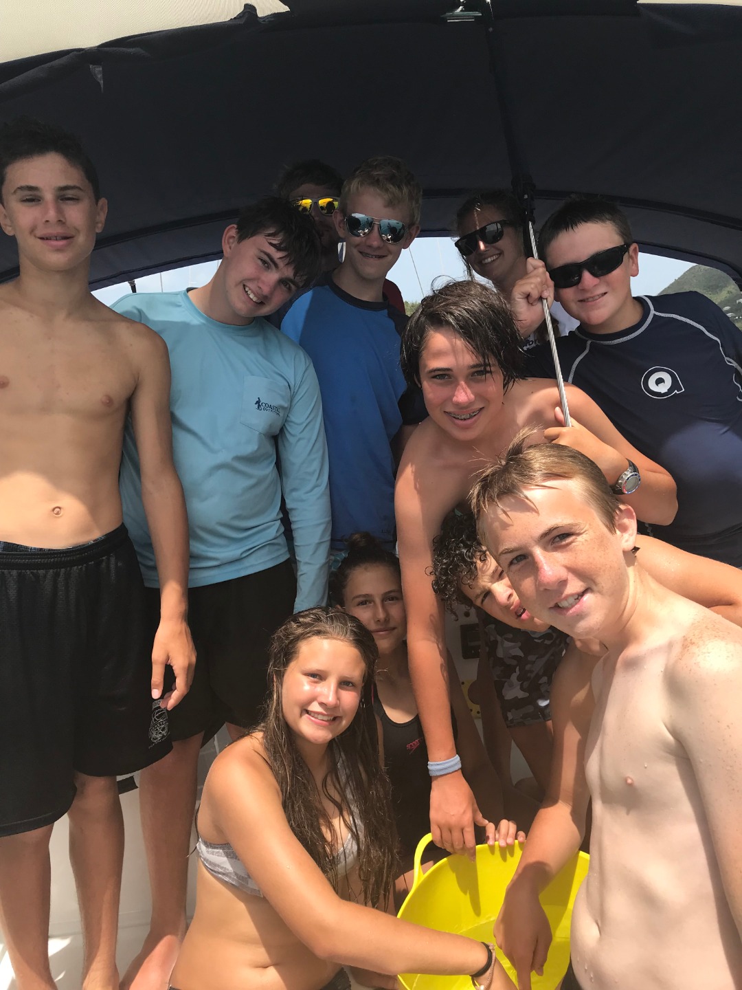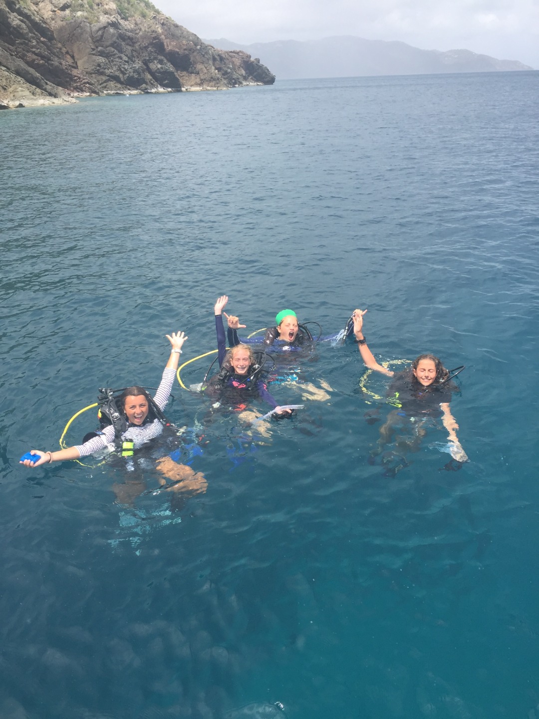 This morning we were back at Muskmelon Bay where we had a full day of rotations. The advanced divers did two dives today, a deep dive followed by a fun dive. For the fun dive, we were able to plan our dive, where we came up with our max depth, time, and plan. The open water students completed their certification with open water dives 3 and 4. They saw lobsters, lionfish, stingrays, and eels. Ellie, Alexa, and Sonya are very excited to be certified divers. I am also excited to be an advanced diver. After diving, we went wakeboarding and kneeboarding and also learned about the ship’s systems and how they work. After rotations, we went to Cane Garden Bay. We dropped two anchors, took fresh water showers, and prepped the boat for our visitor Mike. Mike is the director of ActionQuest, and he came over for dinner tonight to hang out with us and play a card game. Mike brought over a stack of postcards, and he asked us questions about ourselves. It was nice to find out what people thought of themselves. Now to the dish team is doing the dishes and we are getting ready for our sail chat tonight. We are all very excited for tomorrow’s hike/port day. Today was packed full of activities, and everyone had a great time.