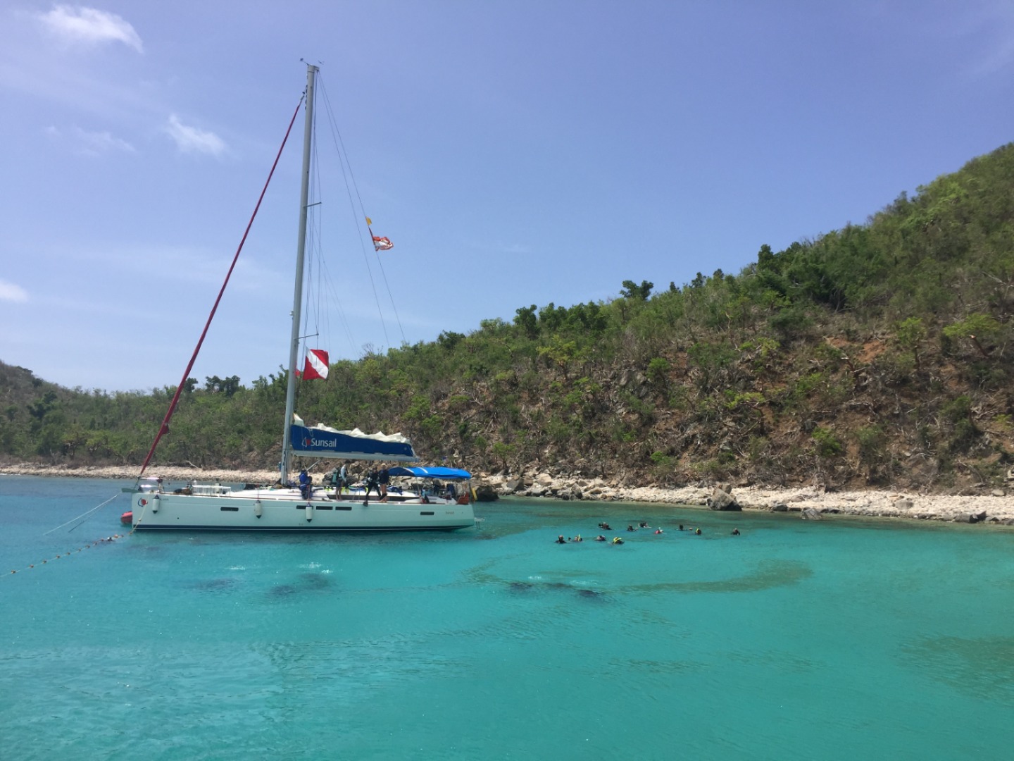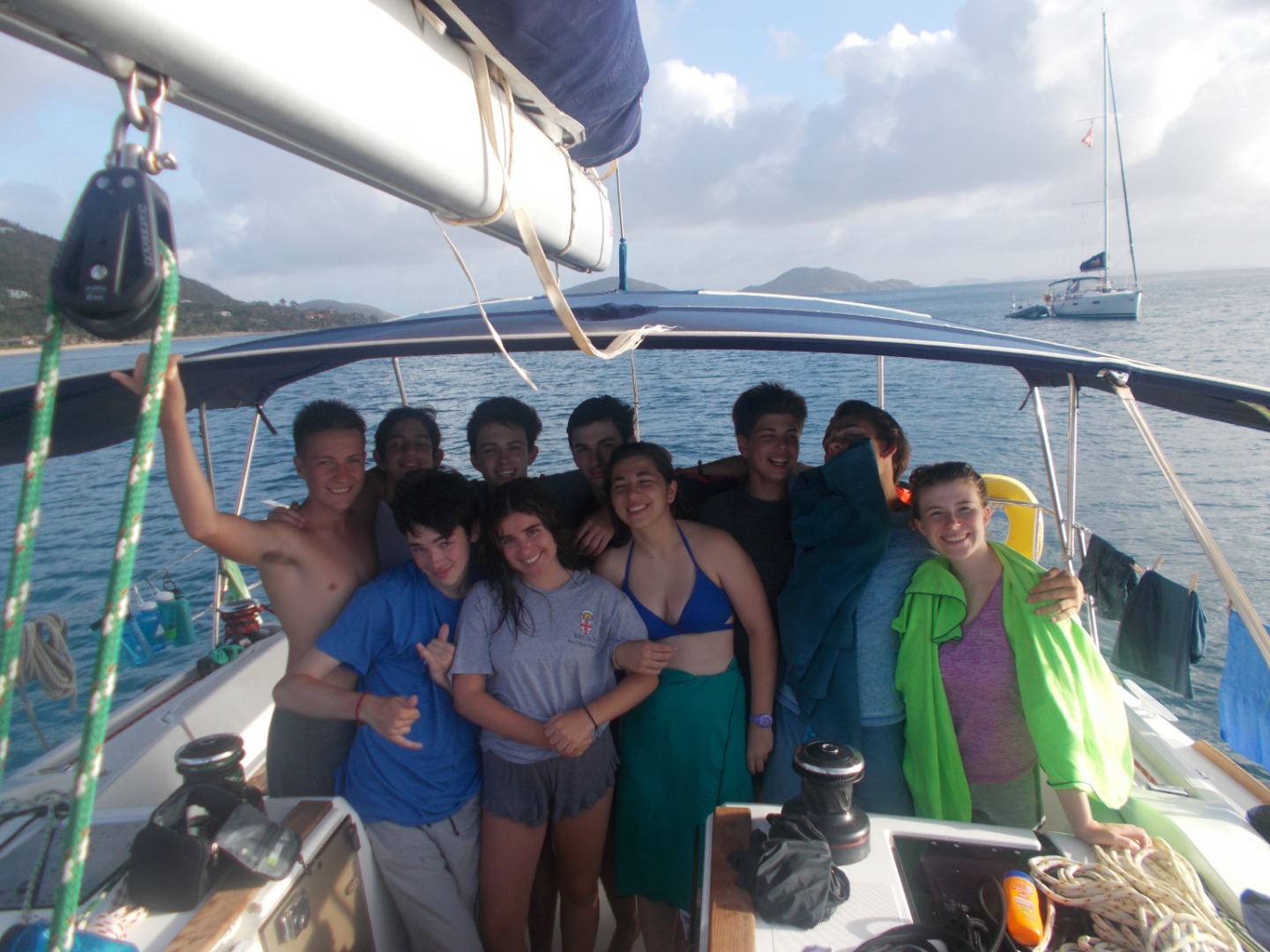 This morning we got to relax a bit. Some of us tried breakfast burritos for the first time. It was good, but it was just more American nonsense. Then we dove into a sail chat. We learned about lights and collisions. Even though it was a hot summer day, we had soup for lunch. After lunch, we got to dive for the second time, which was more awesomeness. We dove from a boat for the first time. When we got back from diving some of us relaxed, and others swam. During dinner, we dove deep into a conversation about water. Pretty amazing. I now see that water is blue.