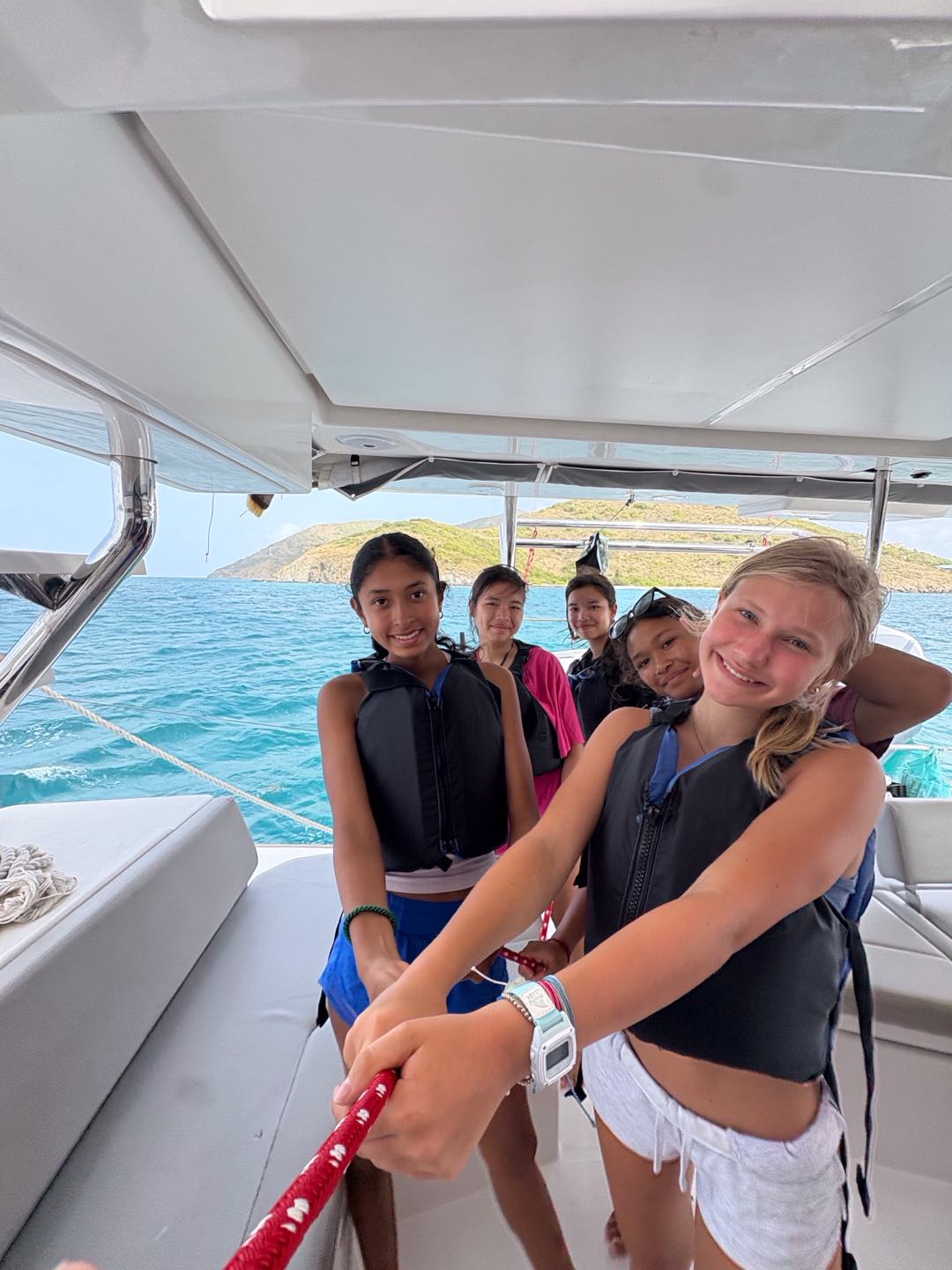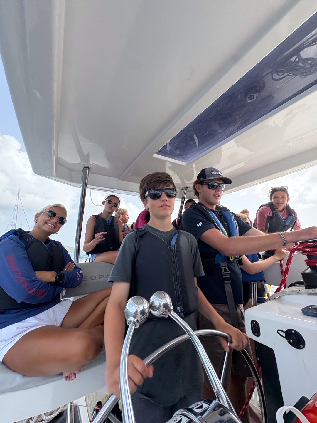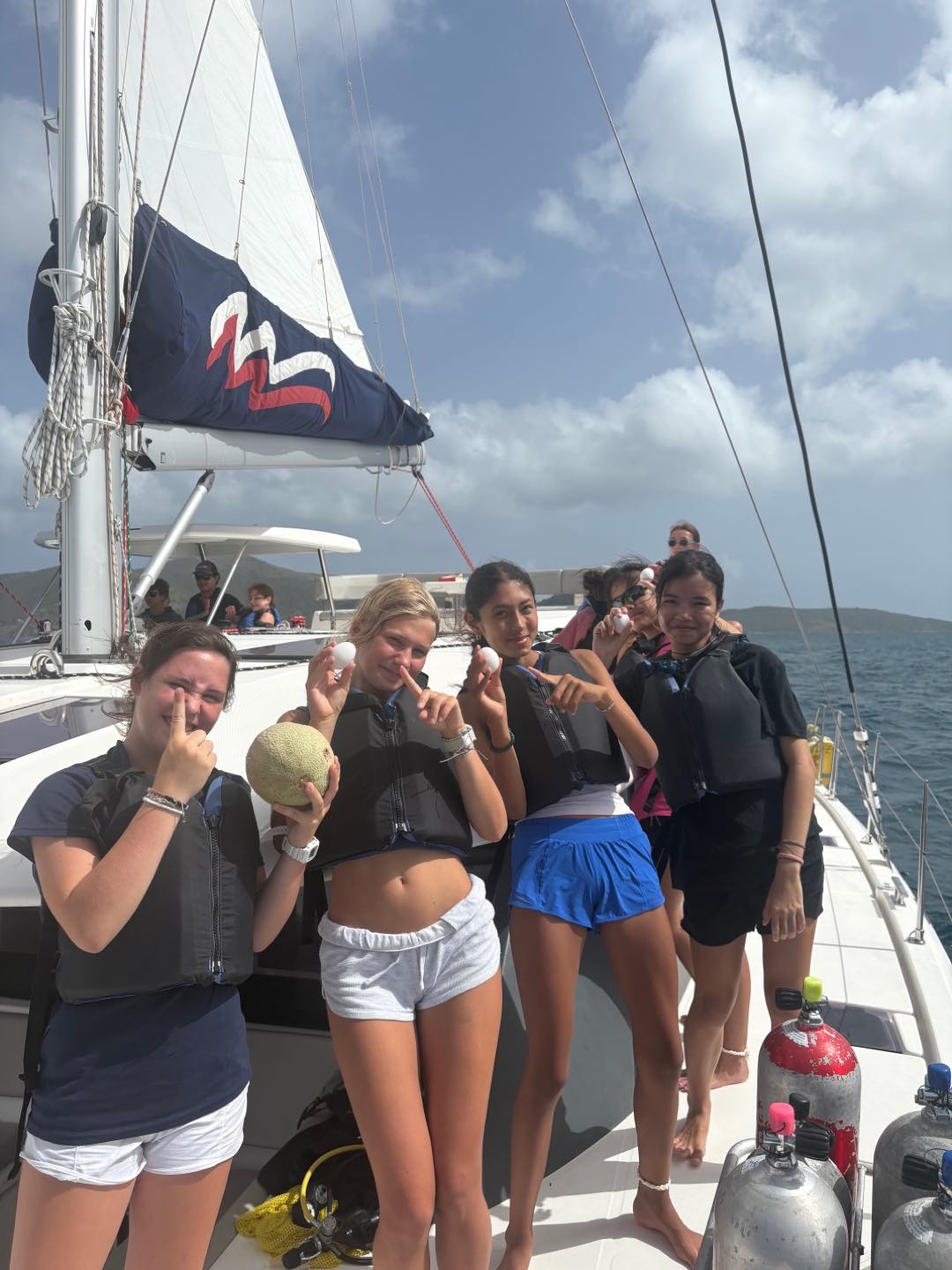 Today we woke up at 7 o’clock to prepare for the big day. After a quick breakfast of oatmeal and cereal, Joey and I went over to a skipper meeting to discuss the upcoming sail race. We approached the starting line, and soon we were off. Izzy, Emme, and Sophia helped us become the first to get the sail up. For a good amount of time we were neck and neck with Nacho Dinghy, eventually they pulled ahead and we were faced with and egg and rotten food war with Pirate Song. Perice and Brian threw eggs and apples at them while Breccan used his shield to protect himself. We ended up failing miserably. After Sophie, Oon, and Mengmei helped deckie-ing, we got some shore time. After everyone’s amazing lunch, we set sail for the rough seas. Everyone had a fun time listening to music on the hard top and feeling the nice ocean spray on our feet. After we got on the mooring ball, we hopped down into the surprisingly chilly water. Everyone loved seeing the Willy T ship wreck, but was Eager to climb on board and get dry. Breccan and Pierce also found some old coins on the ocean floor. Once safely anchoring in Great Harbor Peter, the Minerva boats finally rejoined the fleet after a wonderful dinner of chili and rice, and we ended the night with a friendly game of poker.