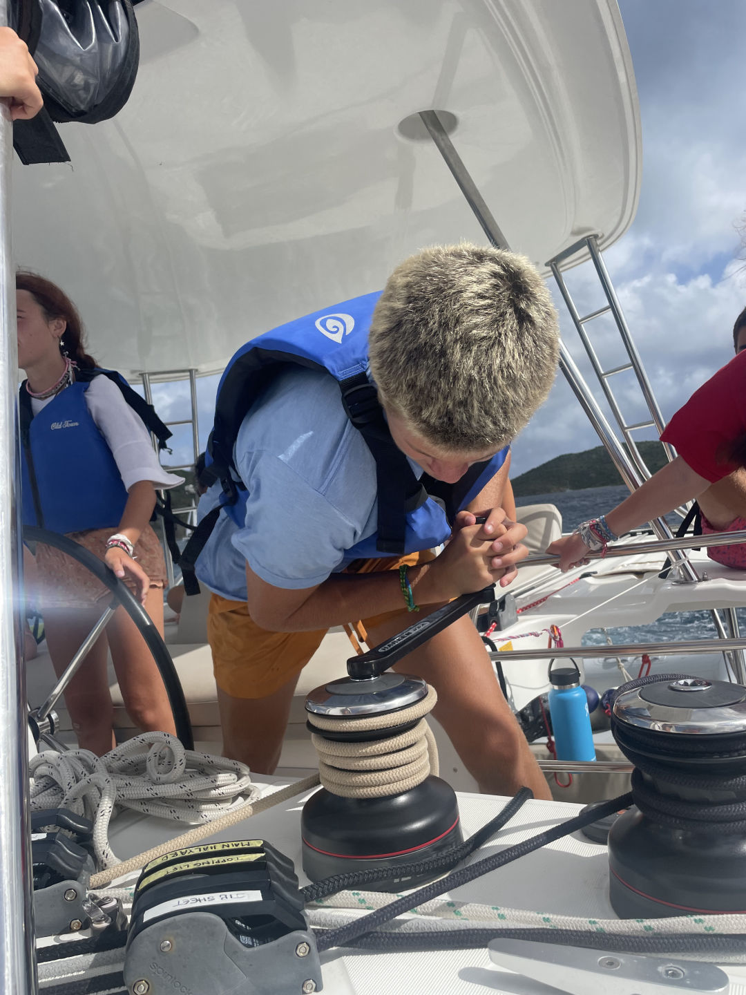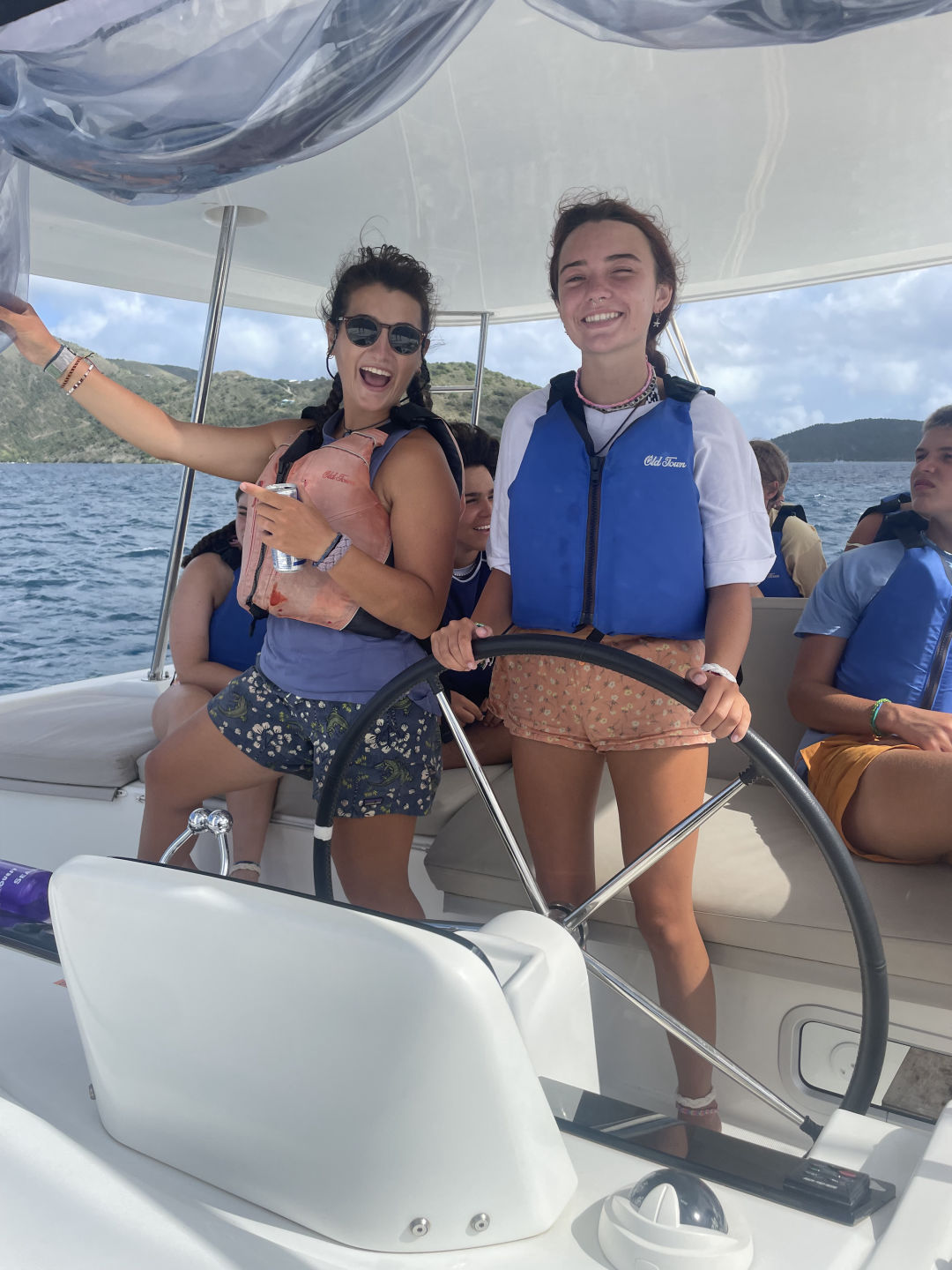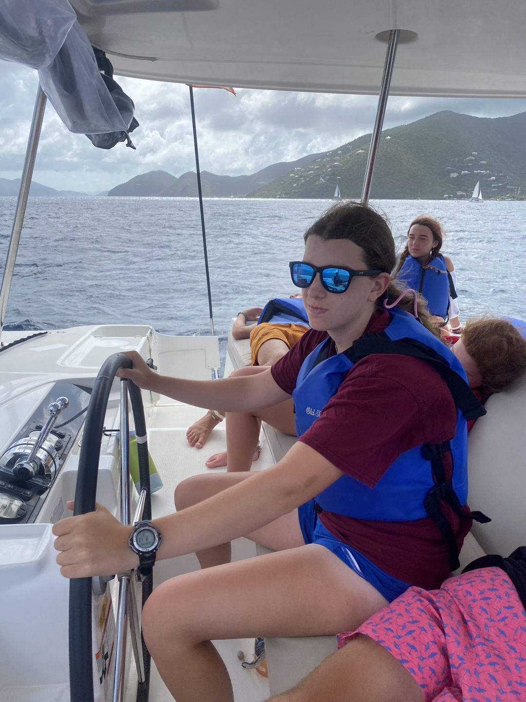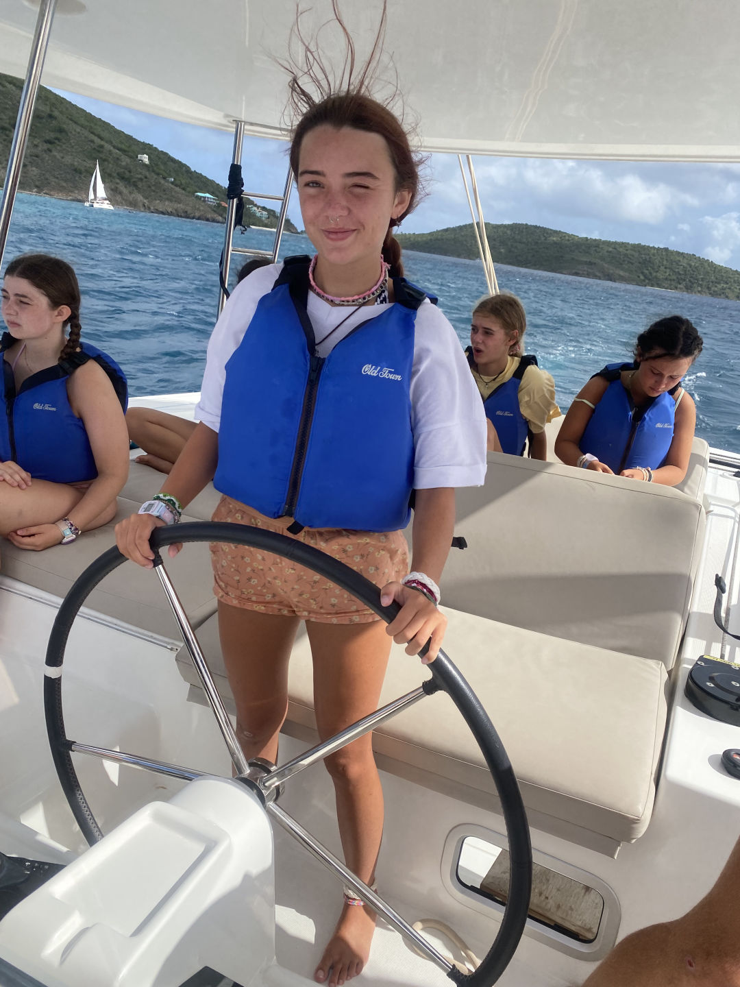 Hi, I’m Brie, and I am from Dallas, Texas. Today we woke up and ate cereal, and then I left with Tait to go to a skipper meeting. Our meeting was for a race we had today, from where we were anchored to where we got water. We got 3rd place in the first race, which was really impressive. Me, Avery, and Belle all got a chance to be on the helm today, and it was so fun. When we got done with the first race, we all got our phones and went to shore. We all walked around for a while to catch up with friends and family then we ate at Omar’s. The food was super good, and everyone loved eating off the boat for a day. While on shore, Tait and I went to another meeting for a different race. We all sat up in the cockpit, and all of us ended up falling asleep. Some of us woke up to help, but Hanna, Amelia, Jack, Aria, Yoni, and Rangeley stayed asleep. When we all woke up, we found that we had got first place for the second race thanks to Belle’s amazing helming! Taylor came back from a different boat because she was diving. Then we all ate dinner and ended the day with Amelia making brownies. Today was a great day. I love you and miss you, Mom, Dad, and Brooks!