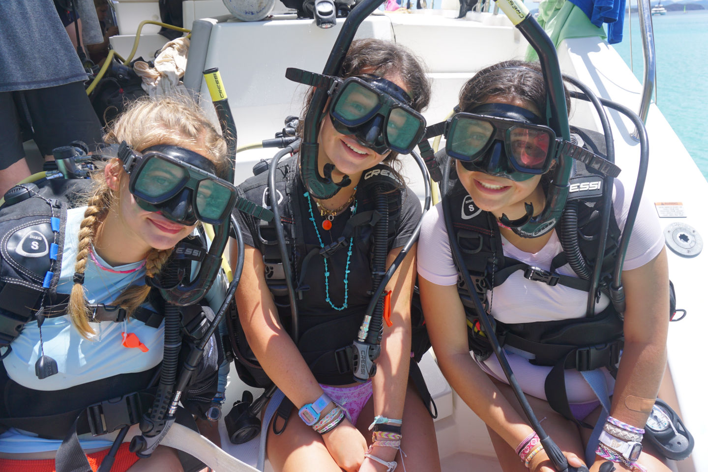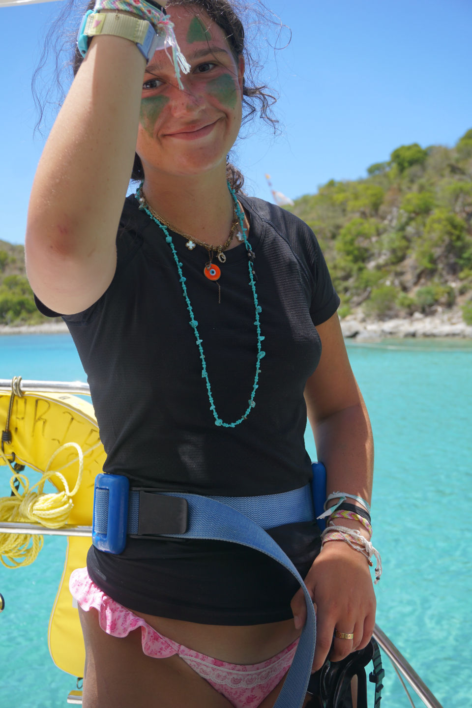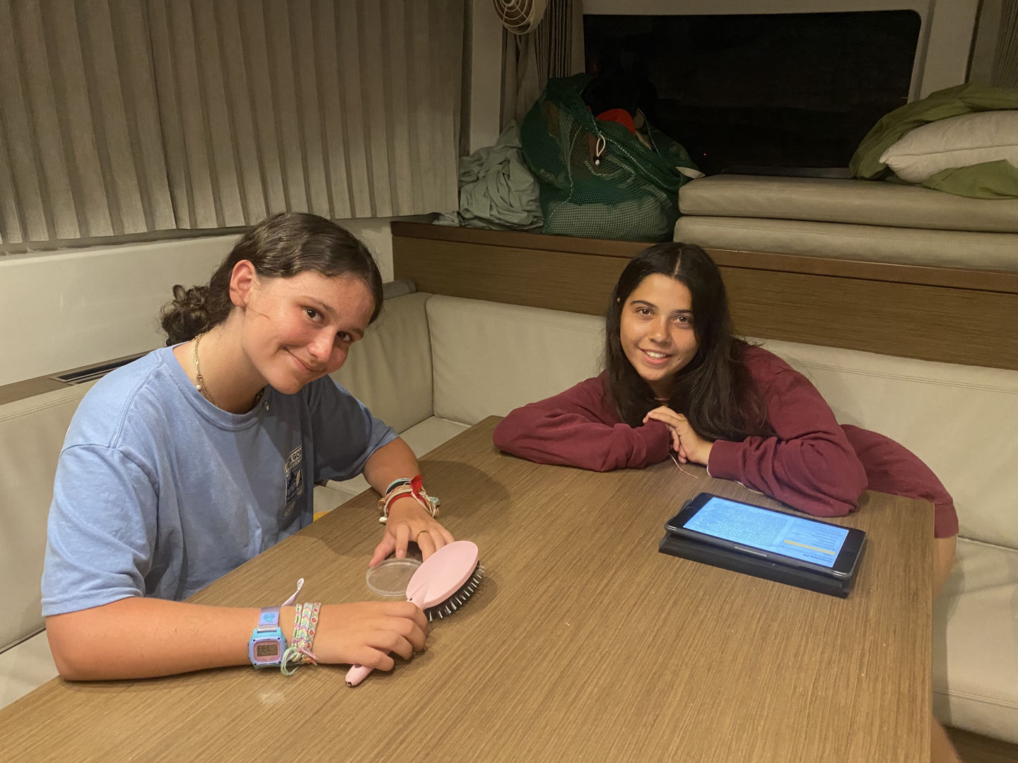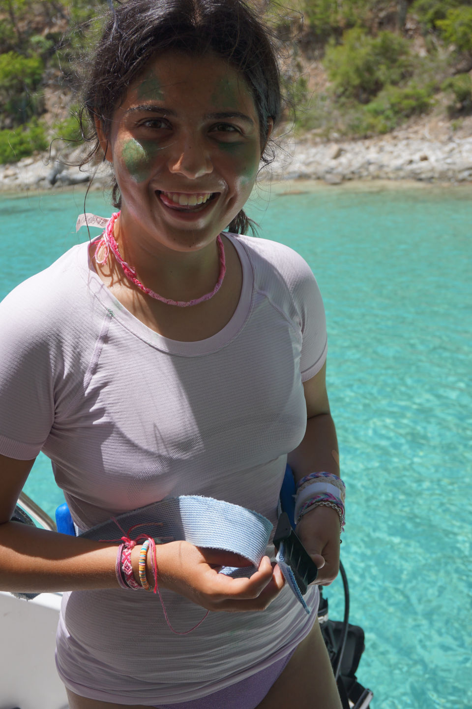 Hi Dad, I miss you and the dog lots. And for the rest of you, my name is Rangeley, and I’m from Palm Beach Gardens, Florida. This morning we woke up to some music to get us going, and then the chef of the day, Jack, helped make us all French toast which we may have had seconds and thirds of. At 8, we had navigation lessons where we learned how to read charts and plot coordinates, then did a lesson on compasses where I learned the difference between the real North Pole and the magnetic North Pole. Lastly, we had a lesson about navigation. Then we had some downtime where Avery, Aria, Amelia, Taylor, and Hanna all made each other friendship bracelets. Then we went out on the dingy for a joyride on our dingy named Sumo while Carlos, Jack, Dylan, Yony, and Bree wakeboarded. On our joy ride, the engine shut off, and we learned how to switch the boat’s gas tank. Then we went back to our boat and had chicken salad wraps for lunch which was my personal favorite of the trip, before heading to the dive boat and gearing up.