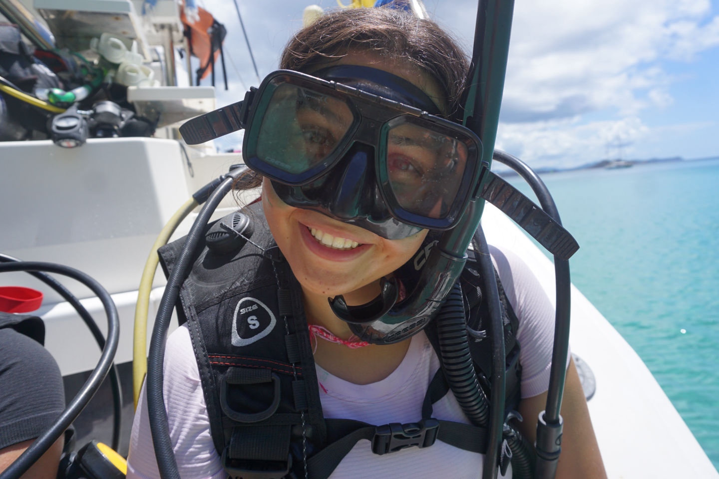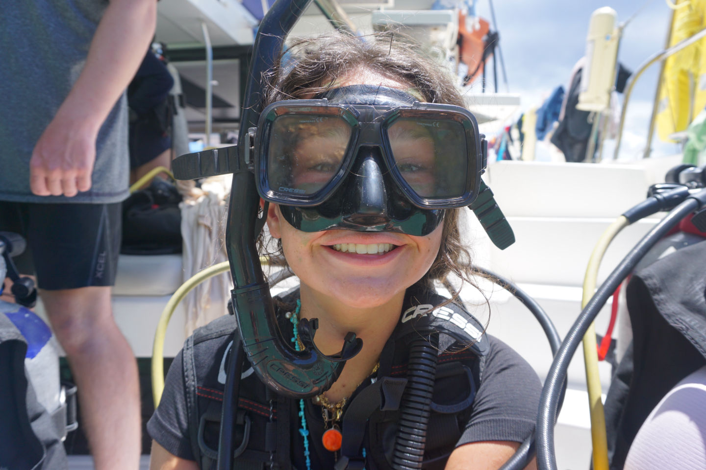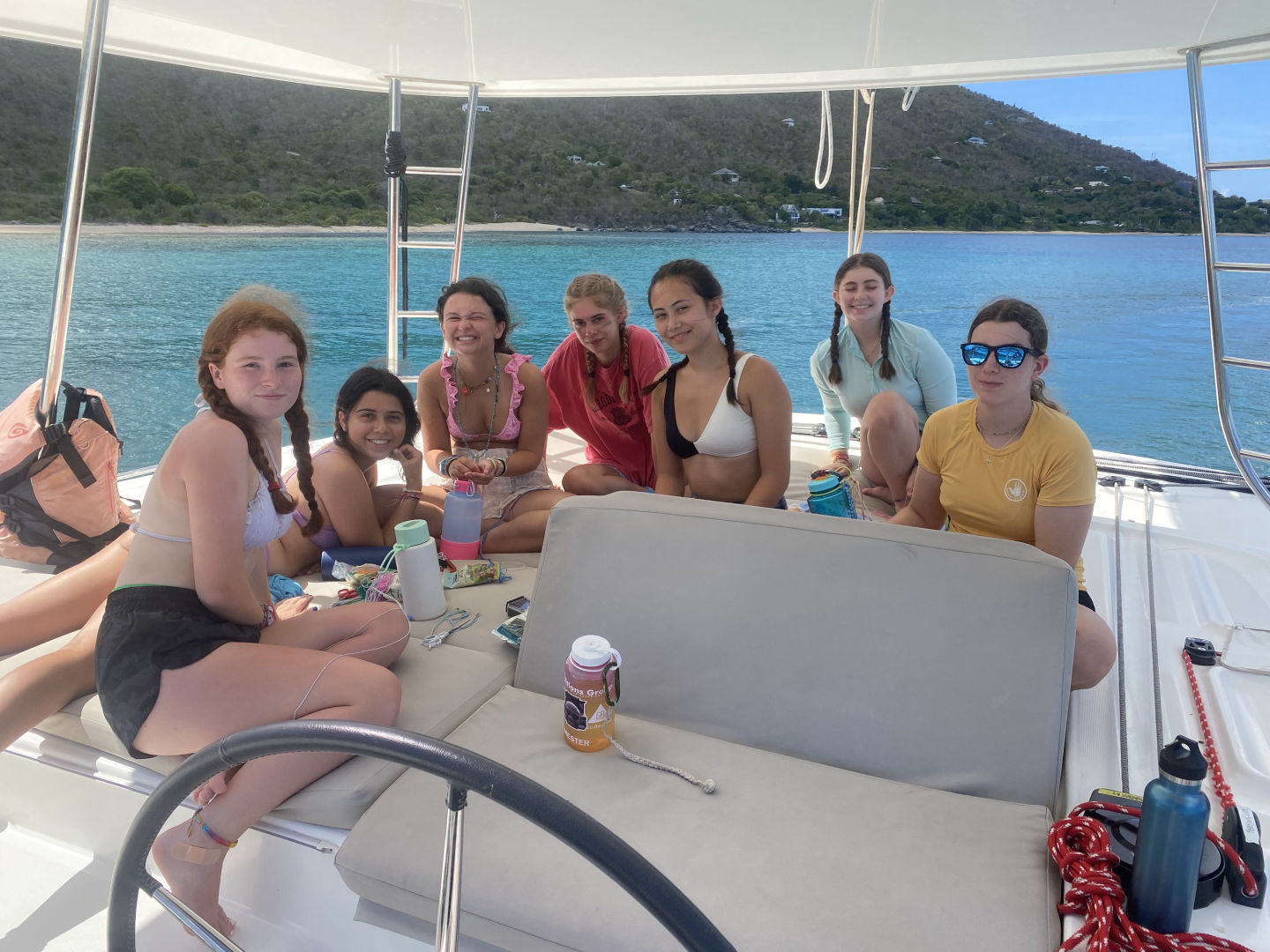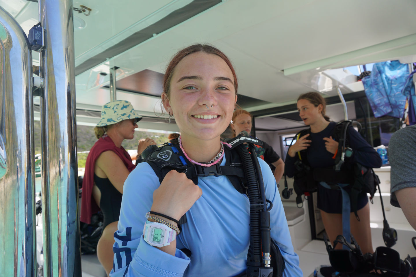 Hi Dad, I miss you and the dog lots. And for the rest of you, my name is Rangeley, and I’m from Palm Beach Gardens, Florida. This morning we woke up to some music to get us going, and then the chef of the day, Jack, helped make us all French toast which we may have had seconds and thirds of. At 8, we had navigation lessons where we learned how to read charts and plot coordinates, then did a lesson on compasses where I learned the difference between the real North Pole and the magnetic North Pole. Lastly, we had a lesson about navigation. Then we had some downtime where Avery, Aria, Amelia, Taylor, and Hanna all made each other friendship bracelets. Then we went out on the dingy for a joyride on our dingy named Sumo while Carlos, Jack, Dylan, Yony, and Bree wakeboarded. On our joy ride, the engine shut off, and we learned how to switch the boat’s gas tank. Then we went back to our boat and had chicken salad wraps for lunch which was my personal favorite of the trip, before heading to the dive boat and gearing up.
